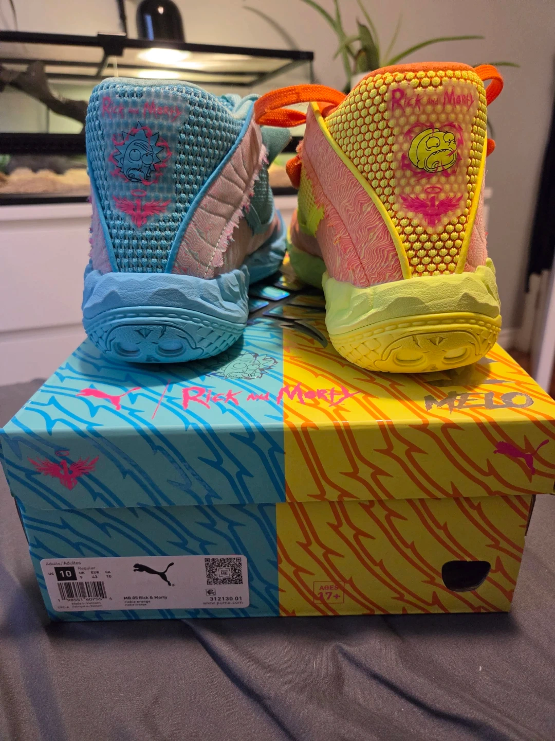 These are the Puma MB.01 Rick and Morty "Melo" basketball shoes in a size 10. They feature a vibrant colourway with designs inspired by the show. Comes with the original box.