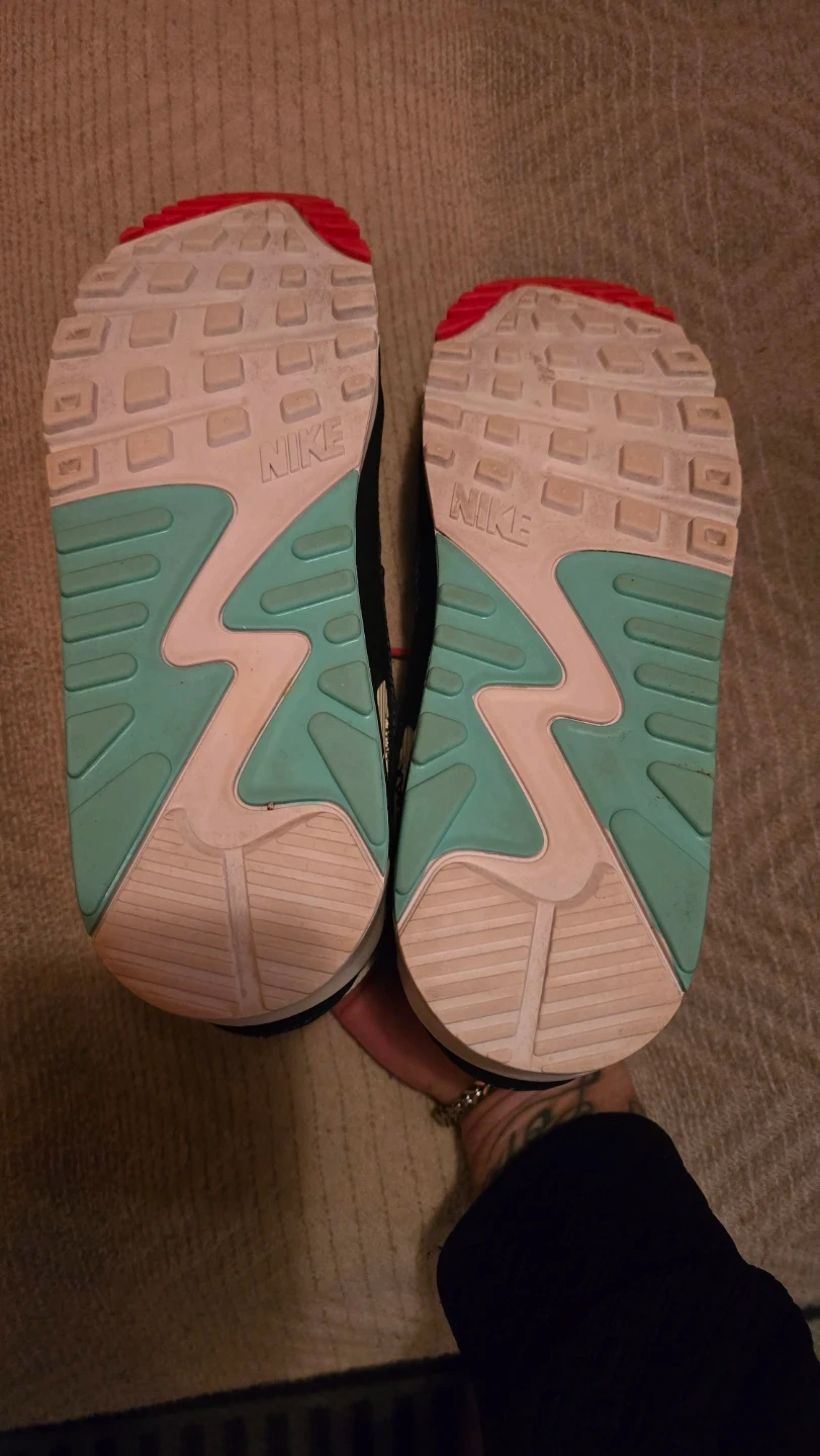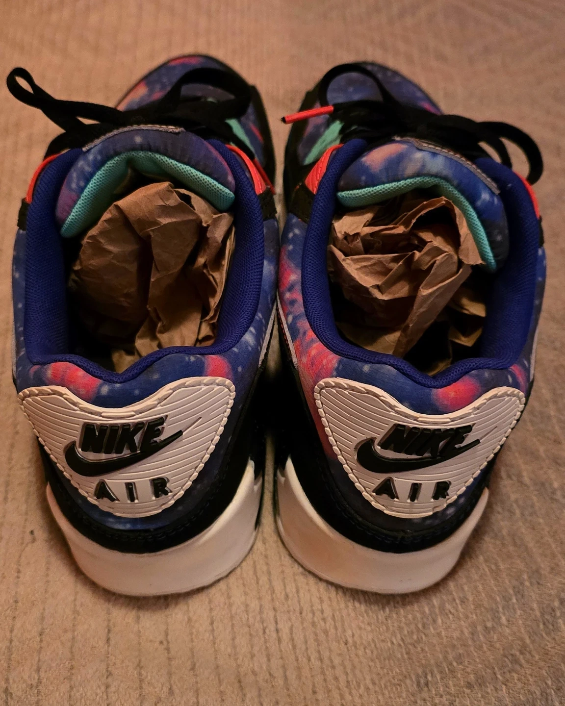 These Nike Air Max 90 shoes come in a "Supernova" colourway from 2020. They feature a blend of blue, red, and teal accents with a space-inspired pattern. Size US Men's 11.