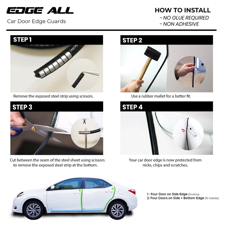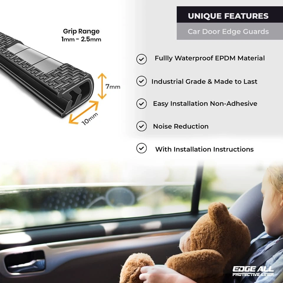 Protect your vehicles from scratches, nicks, and chips with these industrial-grade edge guards! They provide a robust defense against daily wear and tear. Perfect for cars, but versatile enough for boats, fans, and sharp edges. Invest in the longevity of your vehicles. Suitable for all car door edges and motor vehicles. Also used on boat trims, and industrial fans to prevent scratching. Size: 5M/13FT, Thickness: 2MM. Features: Waterproof, Noise Reduction, Dust Blocking, Eco-friendly, Non-Toxic High-Quality EPDM Rubber, High temperature & Corrosion resistance, UV resistance. Protects against door scratches, chipping, rust, leaks, gaps, and vibration. Universal tight fit prevents leakage of air conditioner and blocks the entry of dust, air, and rain. Easy installation and removal with a flexible u-shape rubber that installs directly on the edge trim without adhesive. Use a rubber mallet for a better fit. Removal leaves no residue or damage to paint. Note: The end clips exposed at both ends need to be pulled out before use.