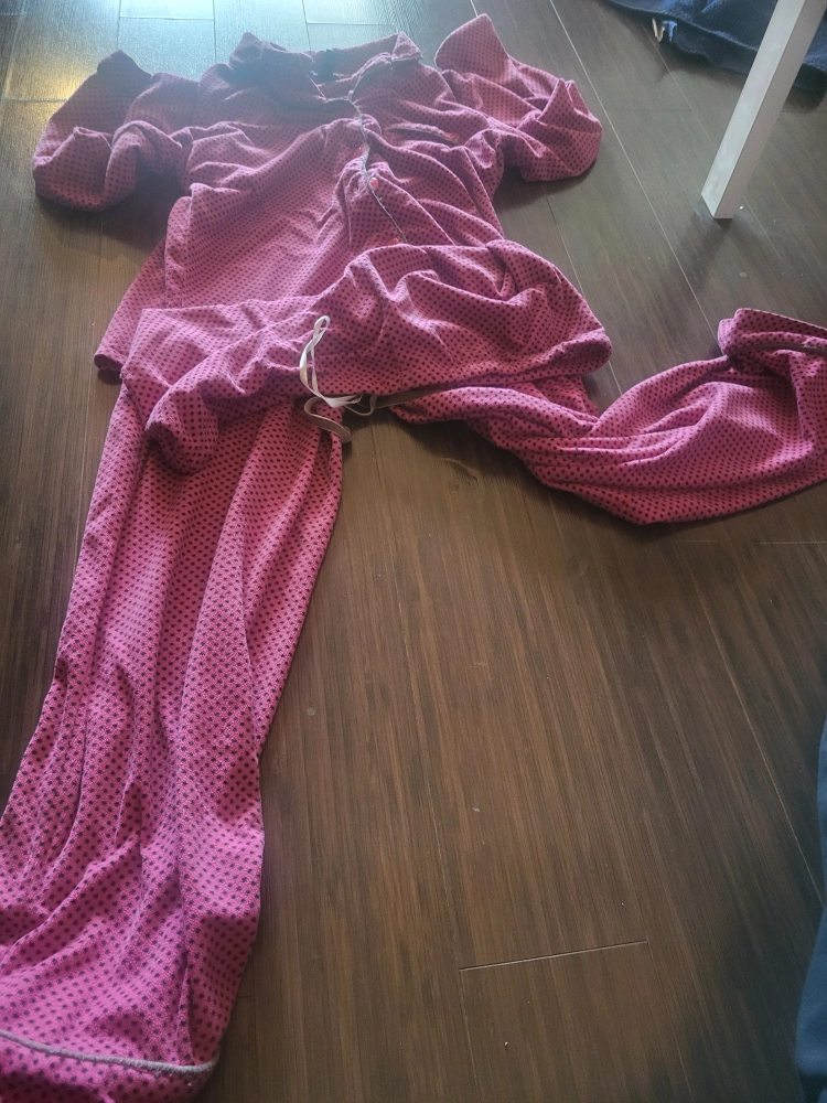 #freecycle Women's pink pajama set. Long sleeve top and long pants. Small black polka dots. Light flannel material.