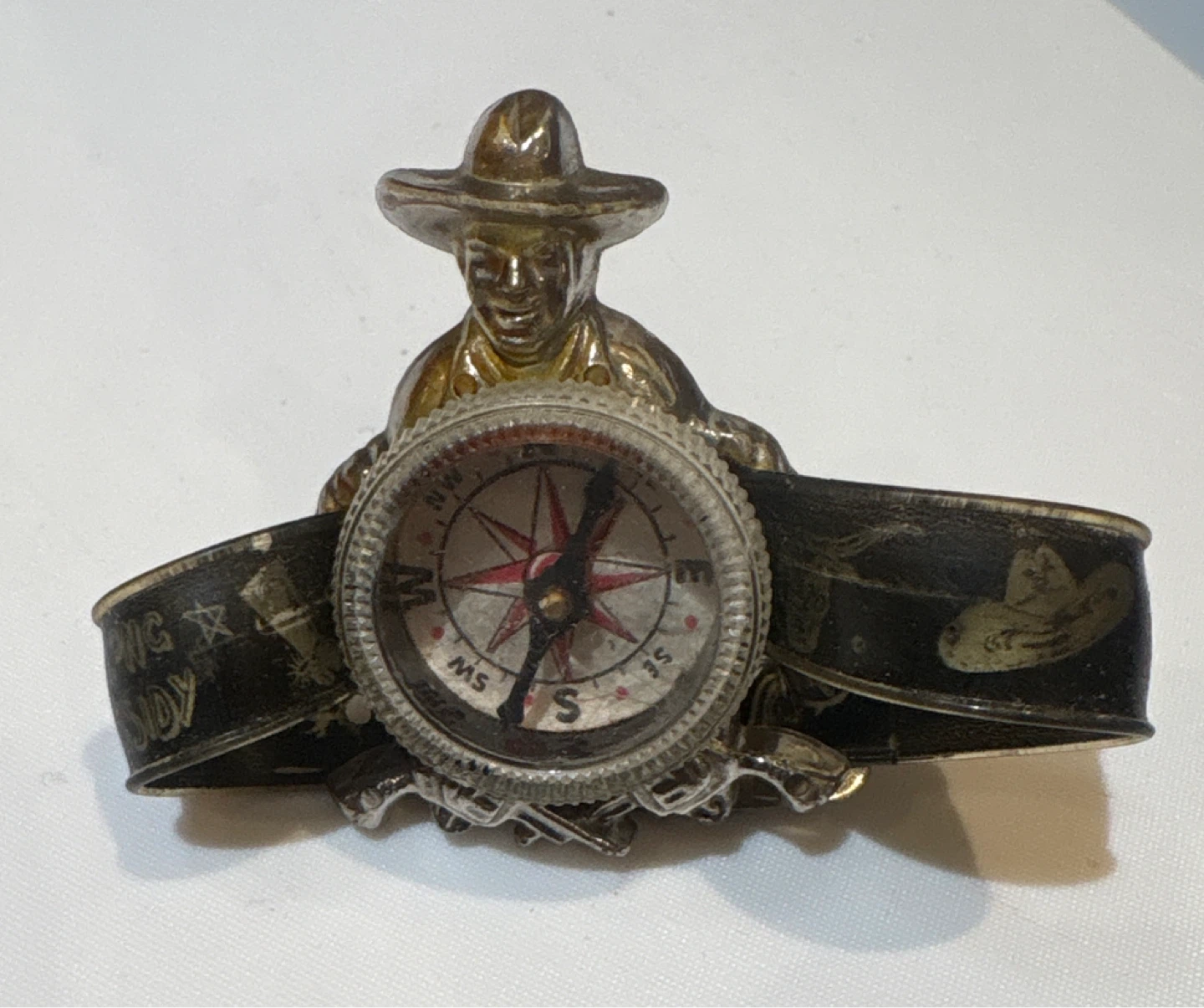 Selling a cool vintage Hop-Along Cassidy cowboy compass compass ! It features a cowboy figure and a functional compass set in a decorative band with western-themed designs. A unique piece for collectors or anyone who loves vintage accessories