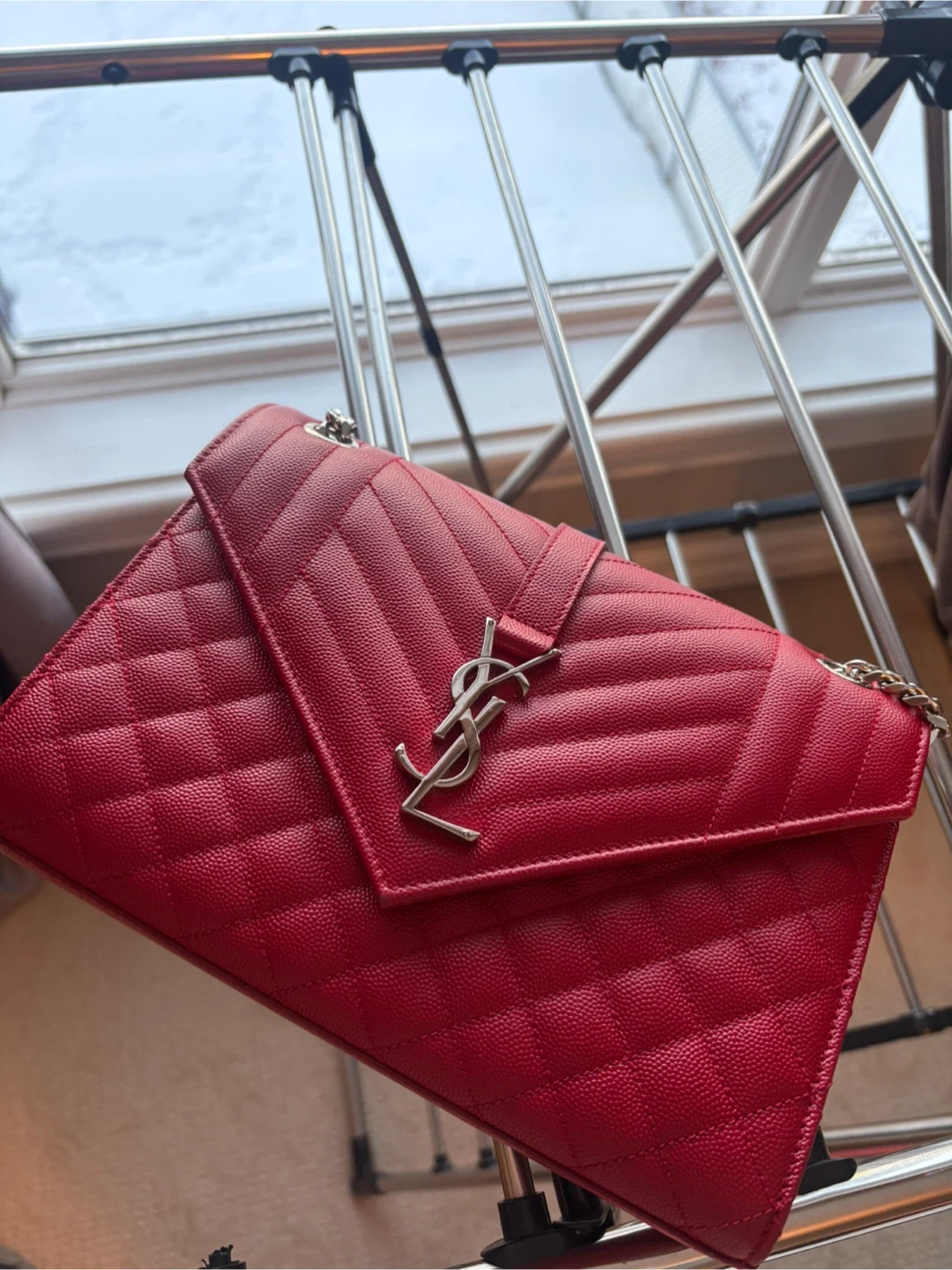 This is a Saint Laurent envelope bag in red quilted leather. It features the iconic YSL logo closure. The bag has a chain strap and is made of pebbled leather.
