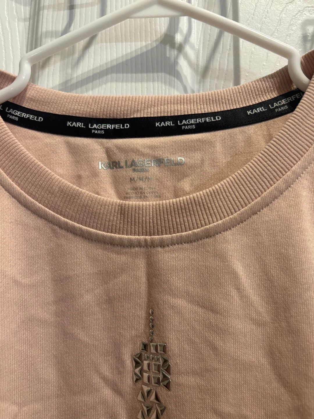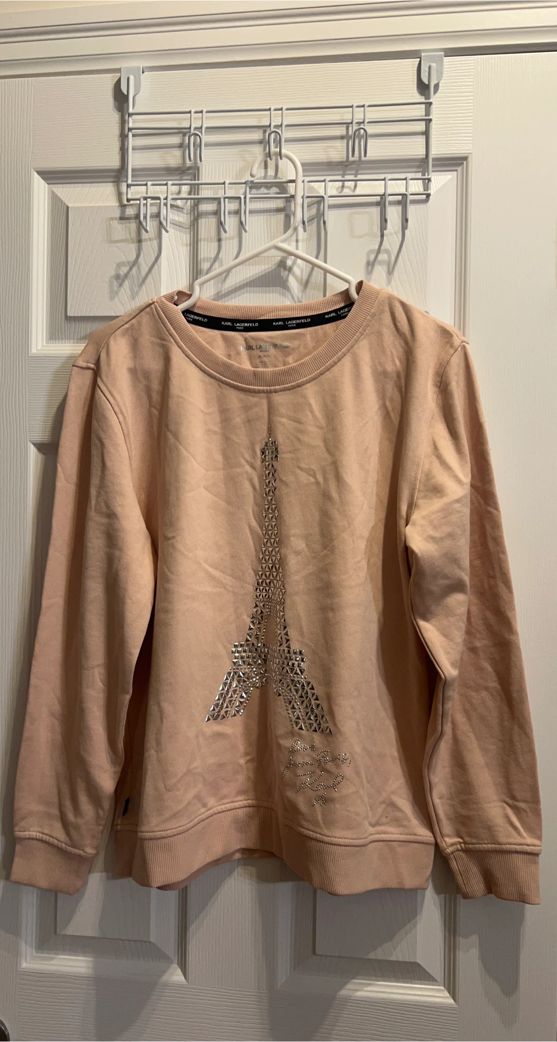 A lovely pink sweatshirt from Karl Lagerfeld Paris, featuring a sparkly Eiffel Tower graphic. It's made of a soft cotton blend. This sweater would be great for a casual day out!