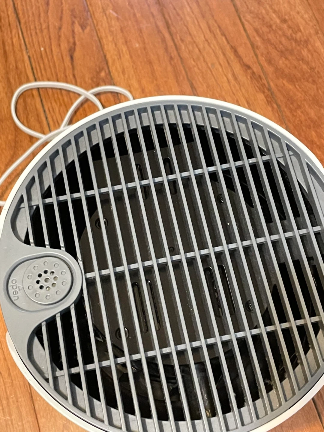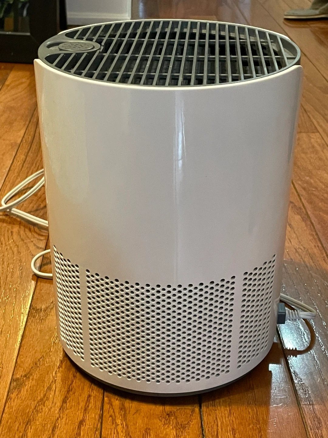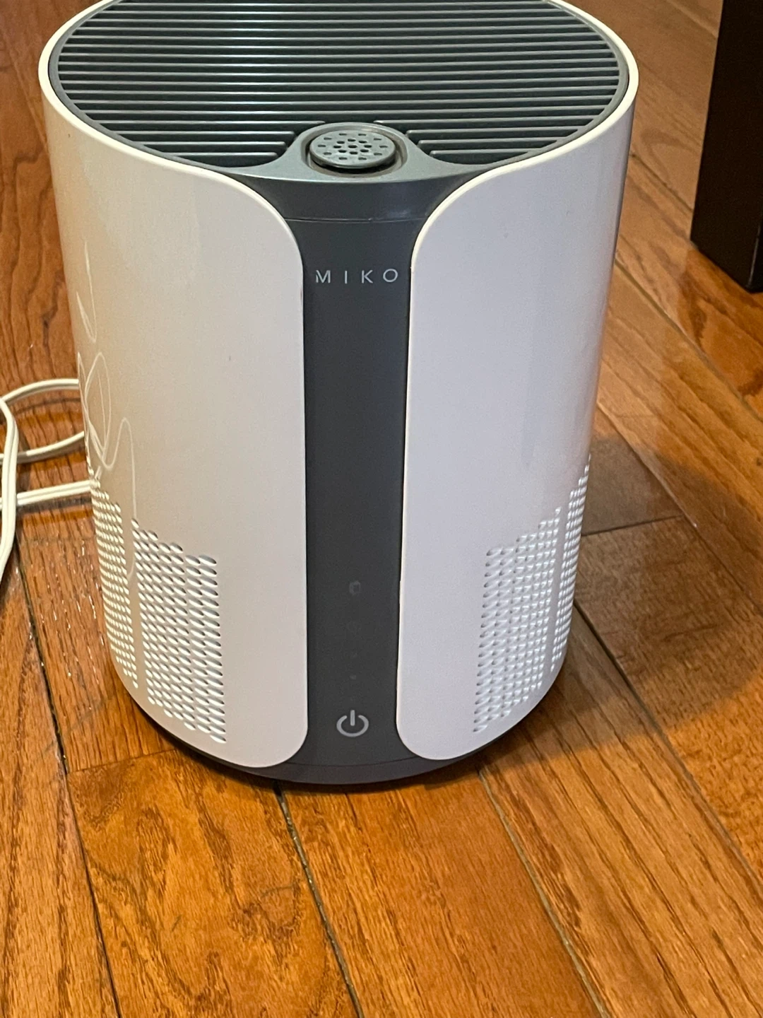 This Miko air purifier helps clean your air. It features a simple on/off button for operation. This unit is white and grey and is from a smoke free home.