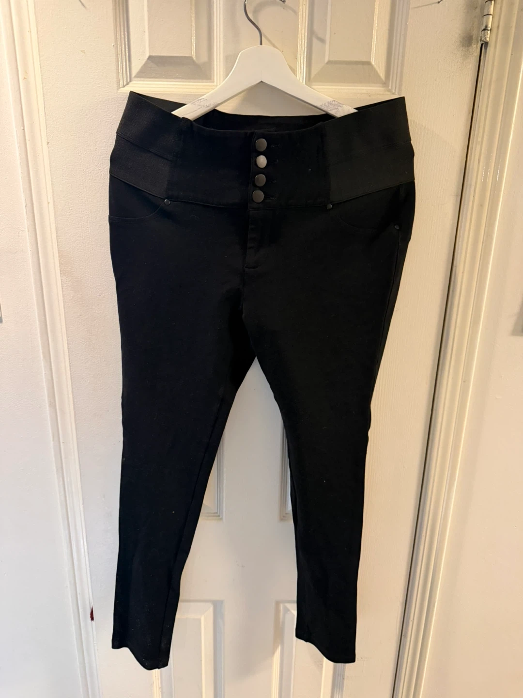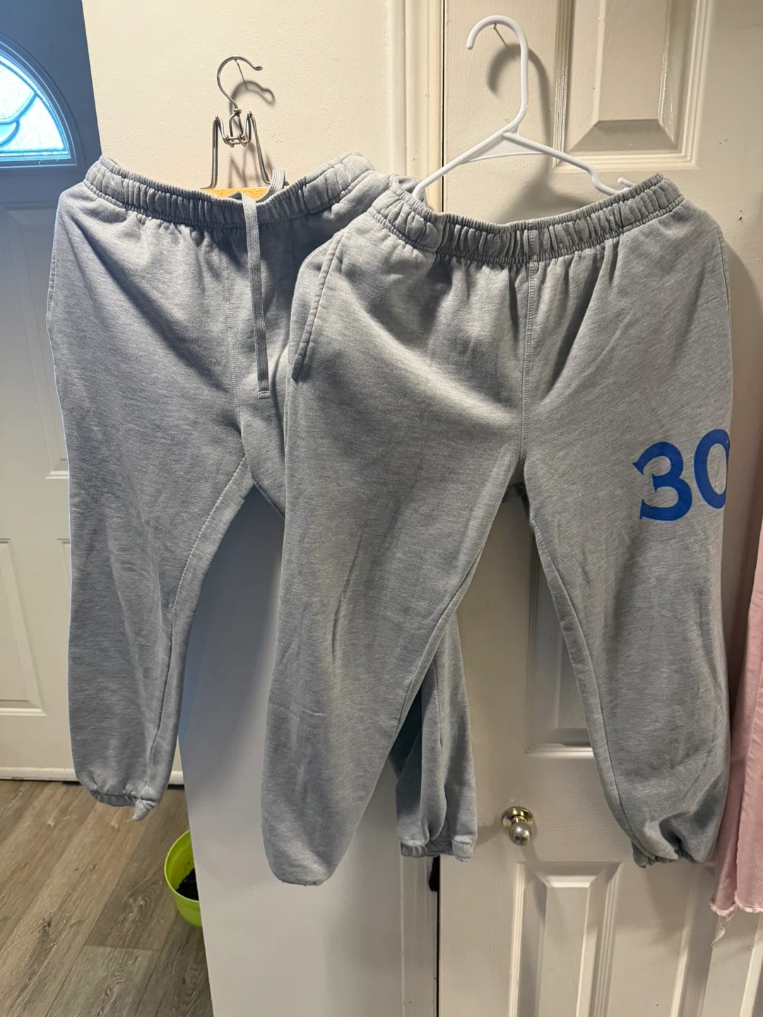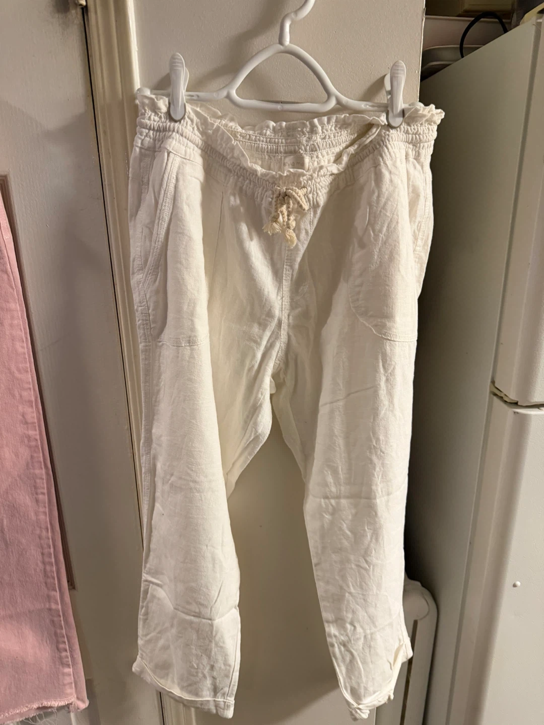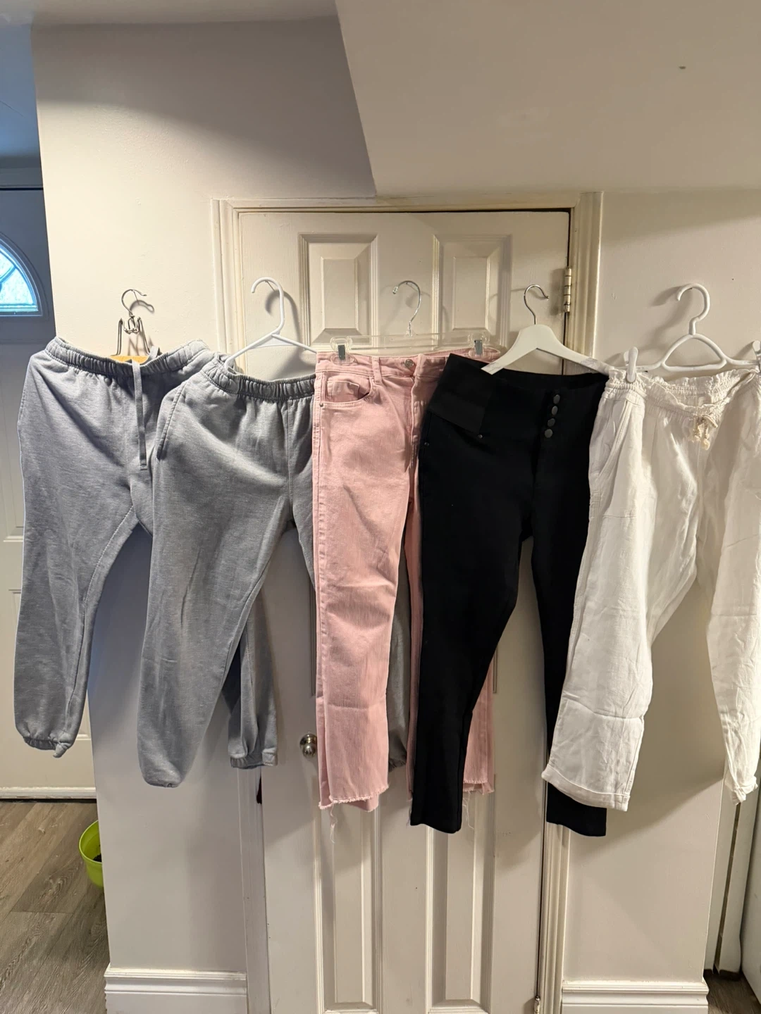 This bundle includes a variety of women's pants. There are black high-waisted button-fly jeans. Also included are pink cropped denim jeans with a frayed hem. A pair of white linen drawstring pants is also in the bundle. Finally, two pairs of grey sweatpants are included, one with '30' printed on the leg. These are great for casual wear or lounging!