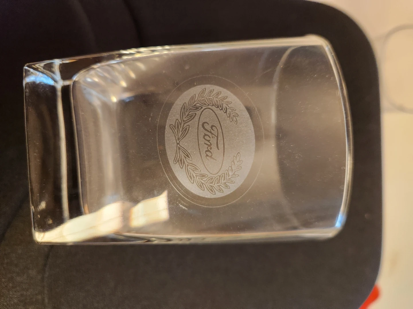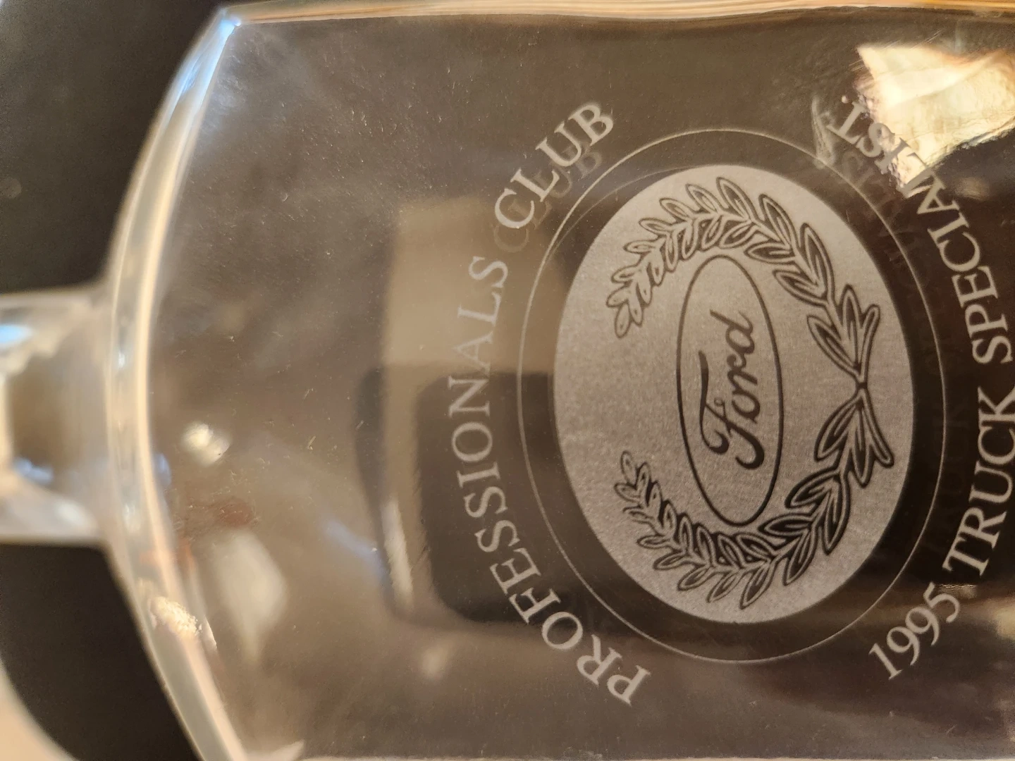 This glass set features the "Ford Professionals Club" engraving and "1995 Truck Specialist" detail. It includes one decanter with a stopper and three tumblers, perfect for a Ford enthusiast's collection. The glasses are made of clear glass.