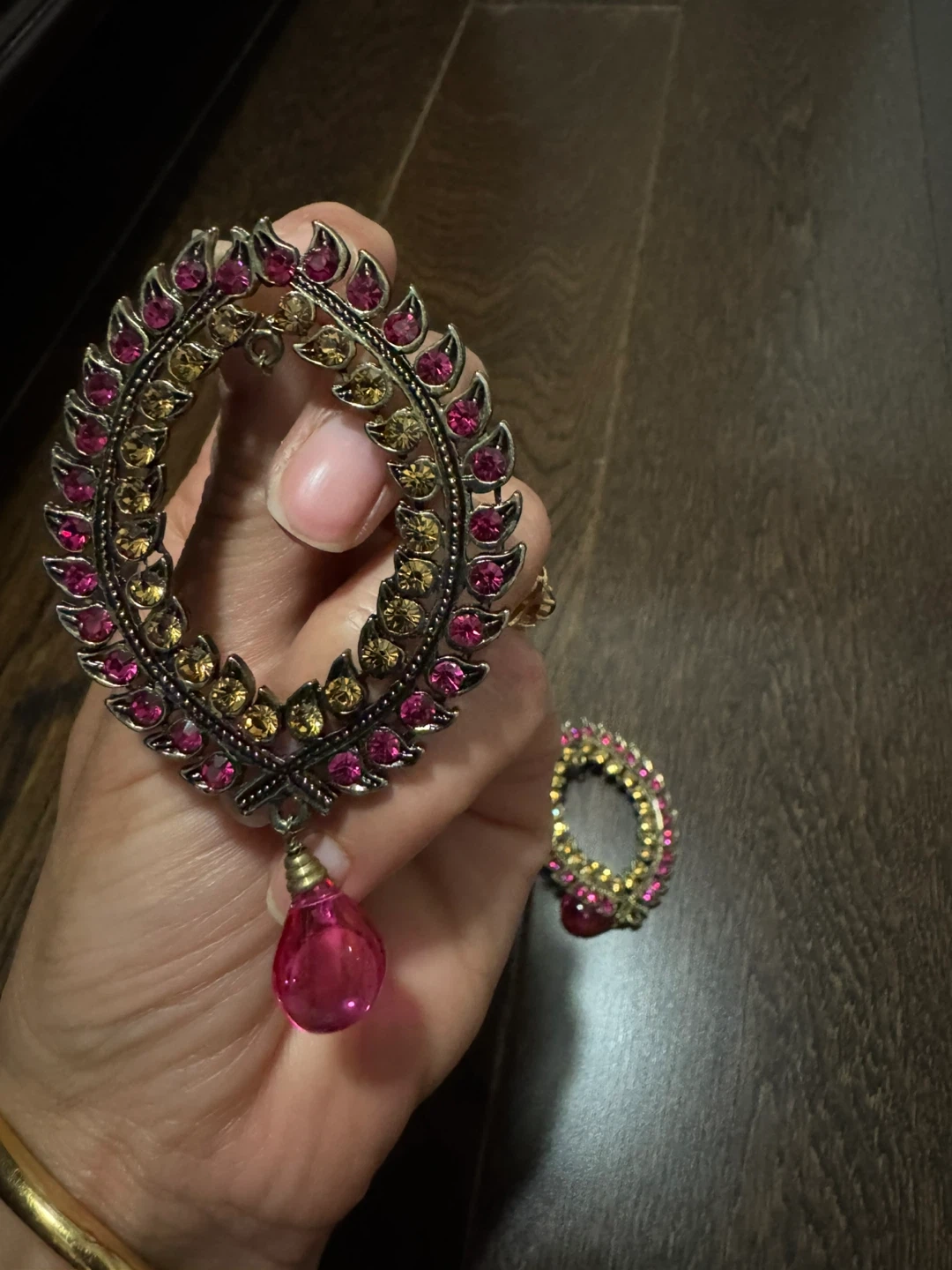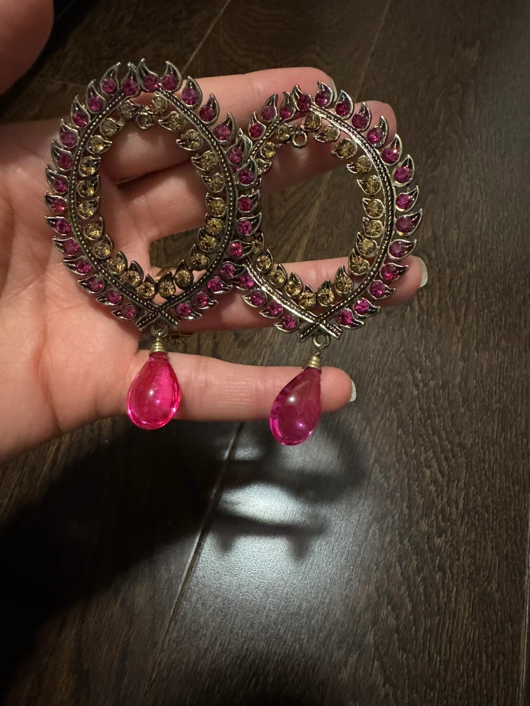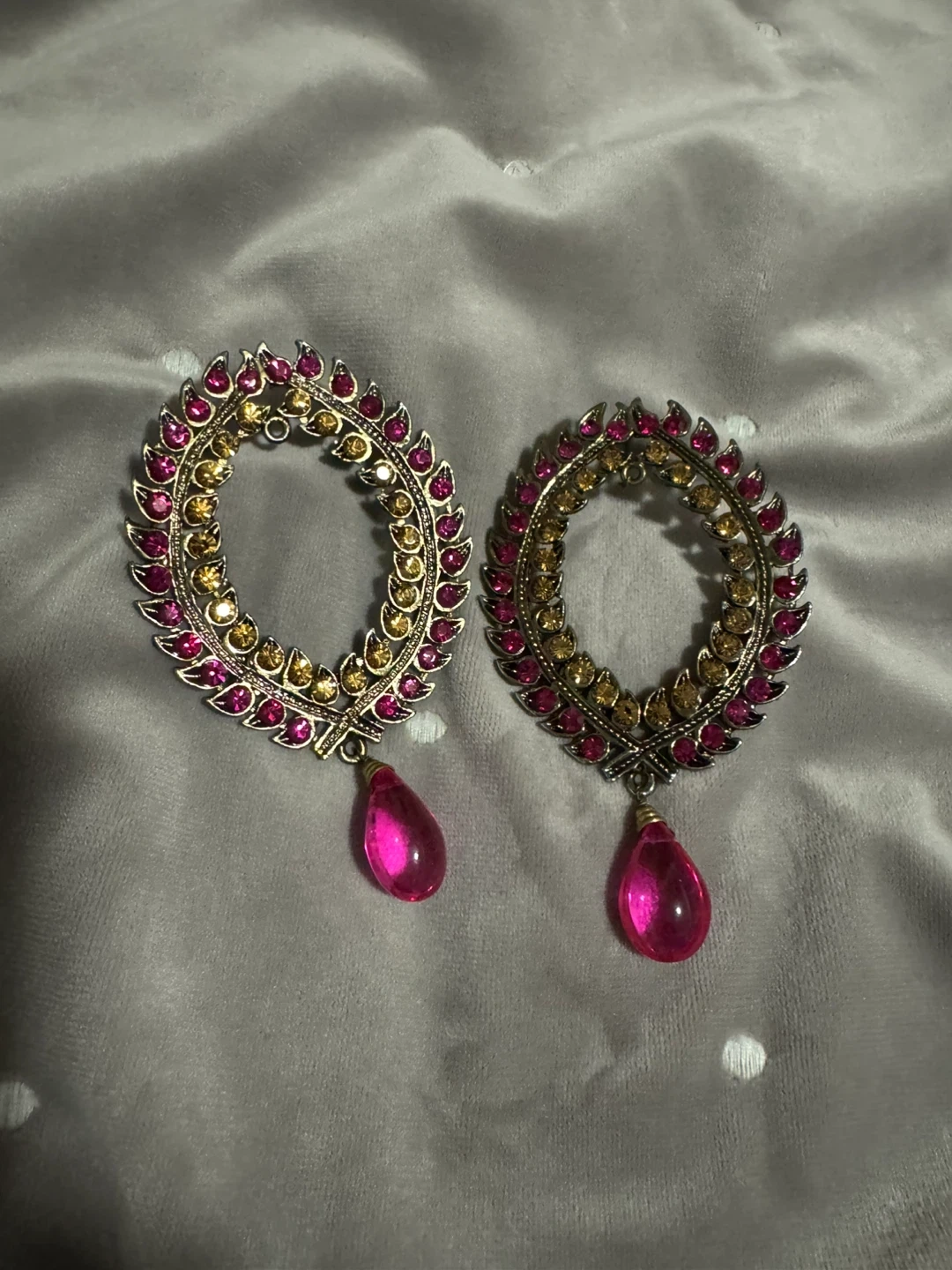 These eye-catching earrings feature an oval hoop design embellished with pink and amber-coloured stones. A vibrant pink teardrop charm dangles from each hoop. They're fastened with a post closure.