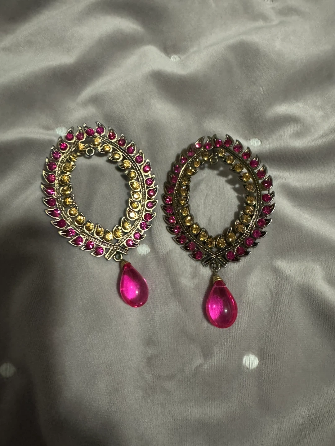 These eye-catching earrings feature an oval hoop design embellished with pink and amber-coloured stones. A vibrant pink teardrop charm dangles from each hoop. They're fastened with a post closure.