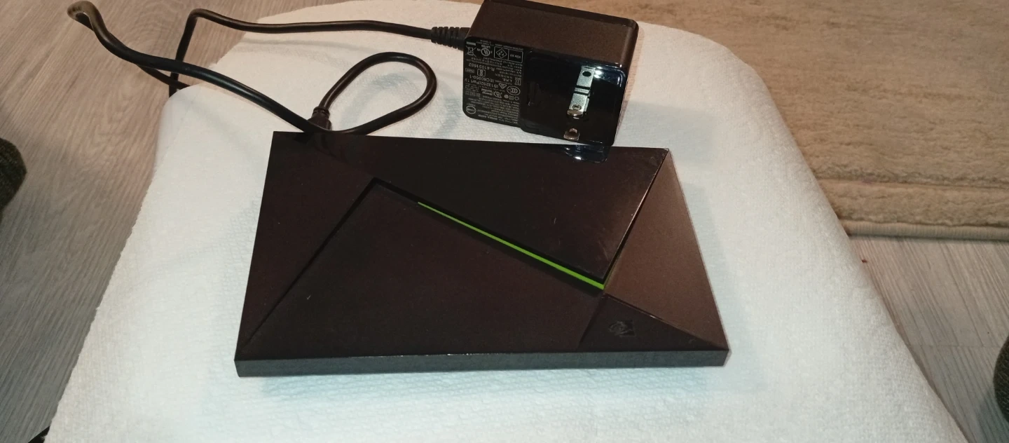 NVIDIA Shield TV Pro Console with controller and power adapter. This unit is black and has a distinctive angular design. It's a great device for streaming and gaming.