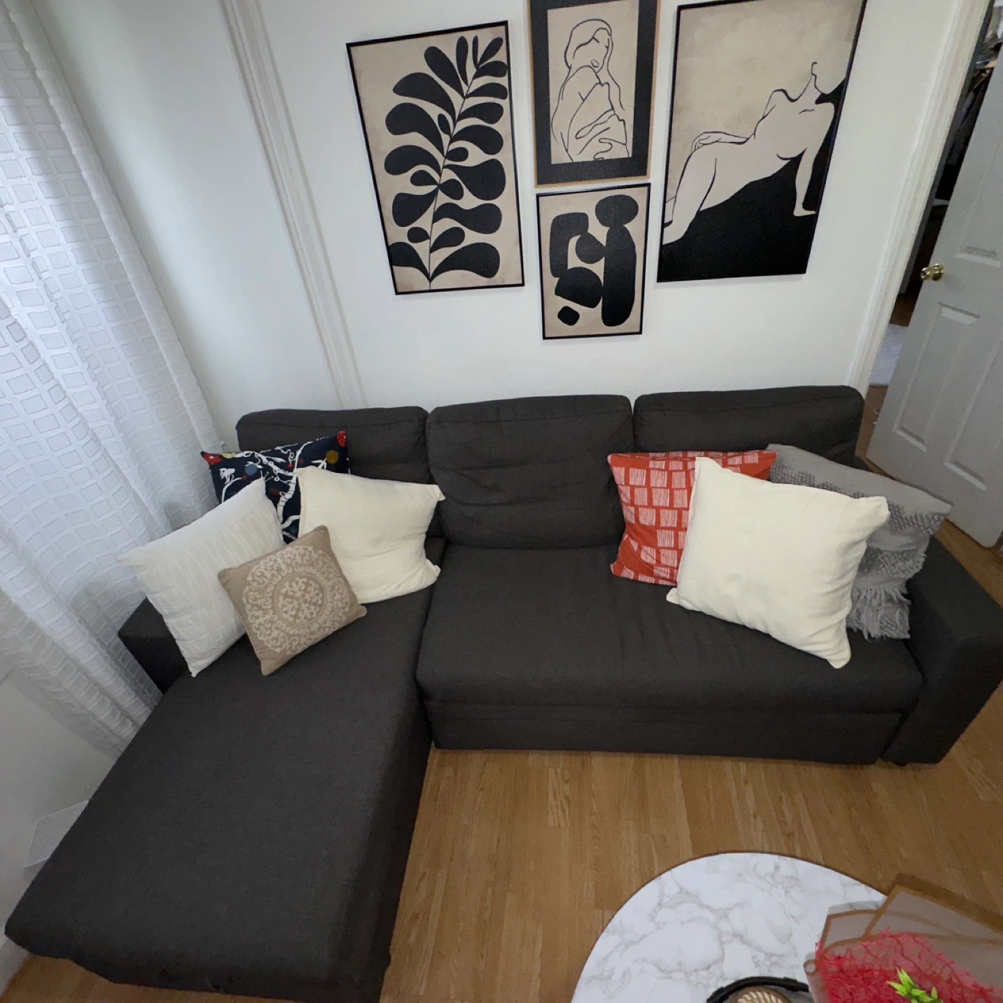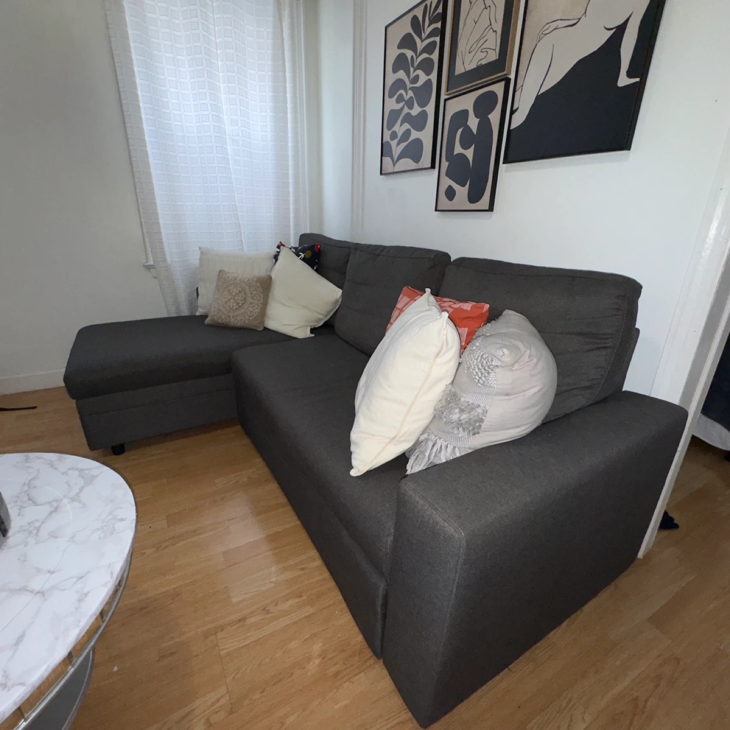 This dark gray L-shaped sectional sofa offers comfortable seating. It's upholstered in a durable fabric. The reversible chaise provides flexible arrangement options. Ample seating for family or guests! In converts to bed, and has storage.