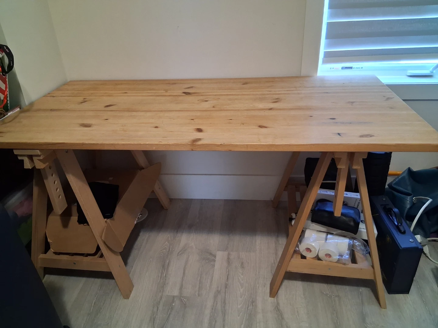 A solid wood trestle desk with a natural finish. The tabletop is made of pine wood. The adjustable trestle legs provide a sturdy base. It's great for a workspace or craft area!
