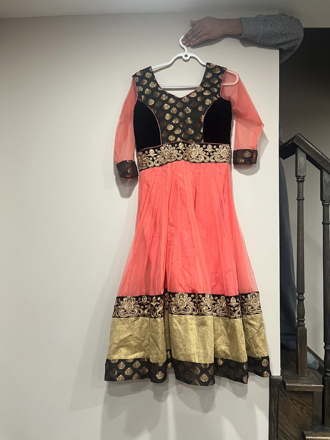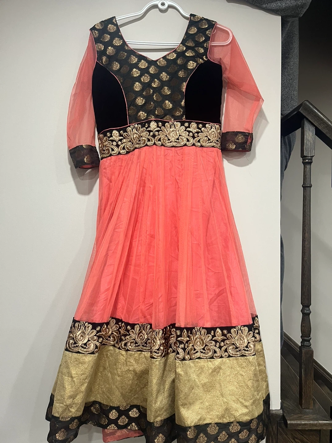 Pretty coral Anarkali dress for girls featuring black velvet and gold embroidery on the yoke and hem. It comes with a matching sheer coral dupatta. Perfect for parties or special occasions!