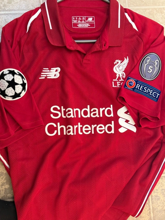 Liverpool home soccer jersey with UCL champions league patches on the sleeves. Size XL. Like new condition. Asking $80. Price is firm. From a bug free, smoke free, pet free home. Cash only please. Pick up only in the South Pembina, Fort Richmond Area.