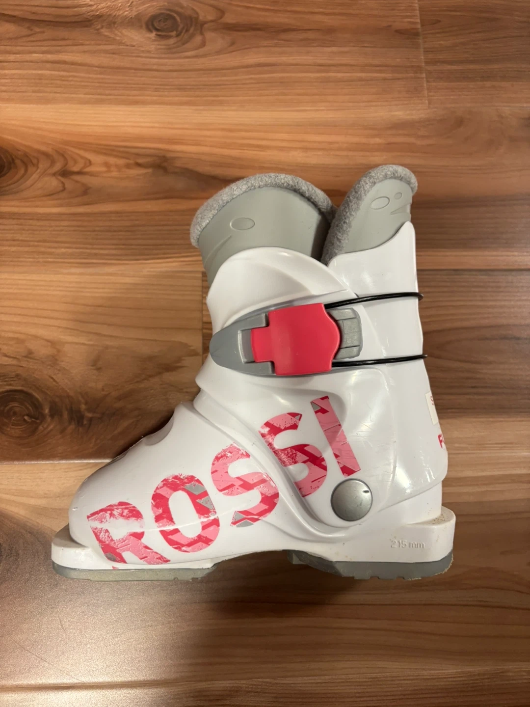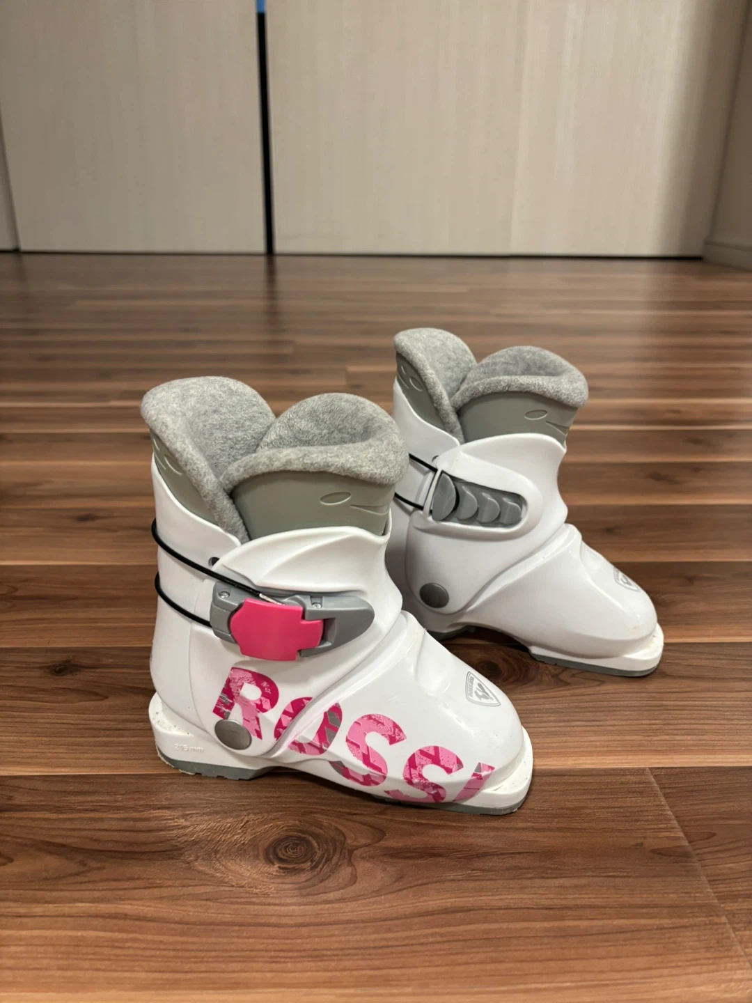 White and pink Rossignol ski boots for girls. Size 175, 215mm sole length. These boots feature adjustable buckles for a secure fit. They're designed for young skiers learning the ropes.