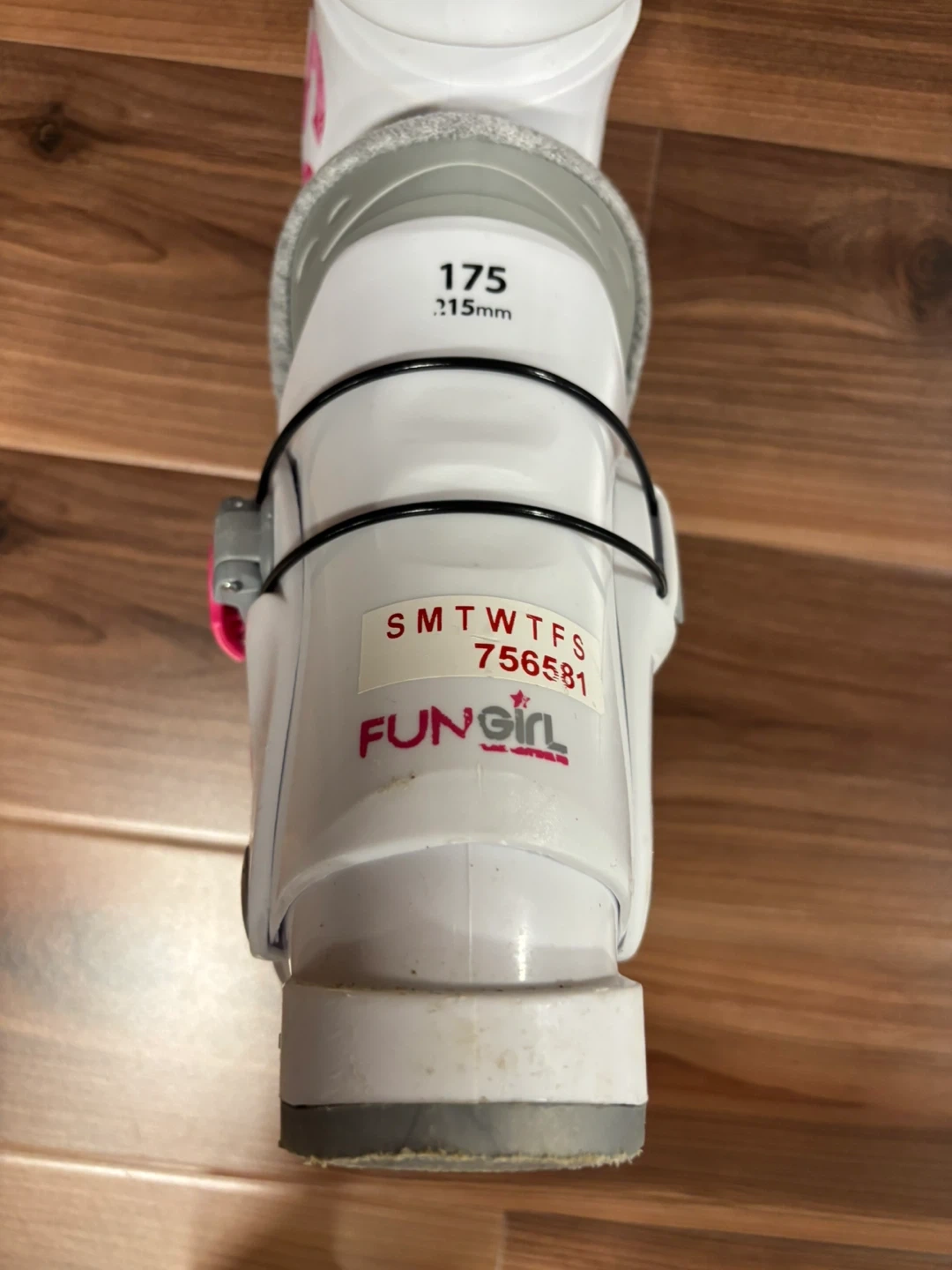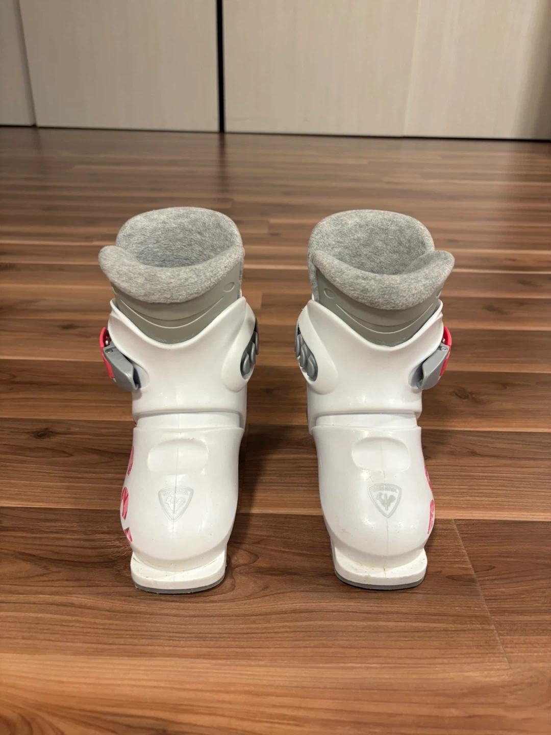 White and pink Rossignol ski boots for girls. Size 175, 215mm sole length. These boots feature adjustable buckles for a secure fit. They're designed for young skiers learning the ropes.