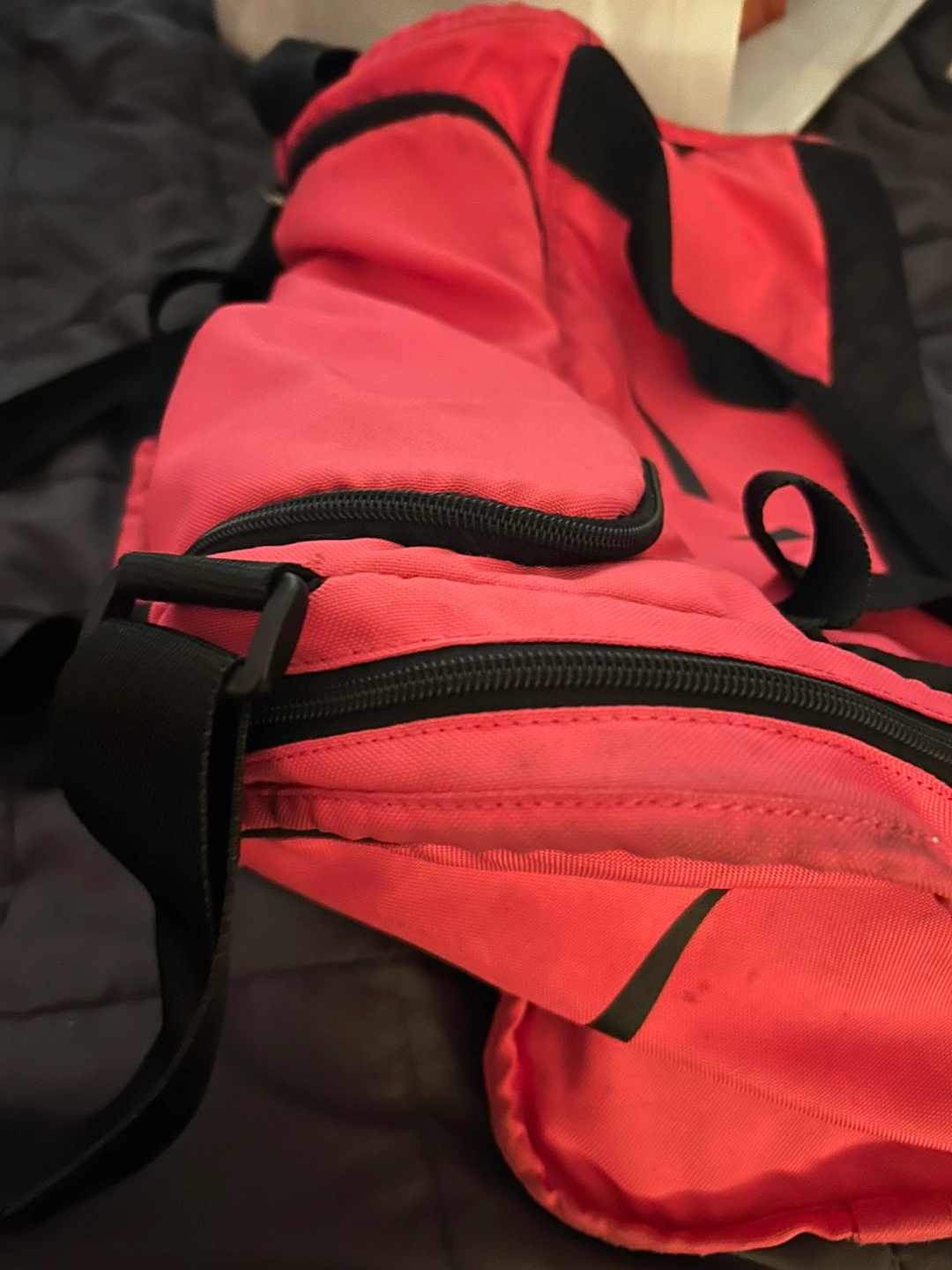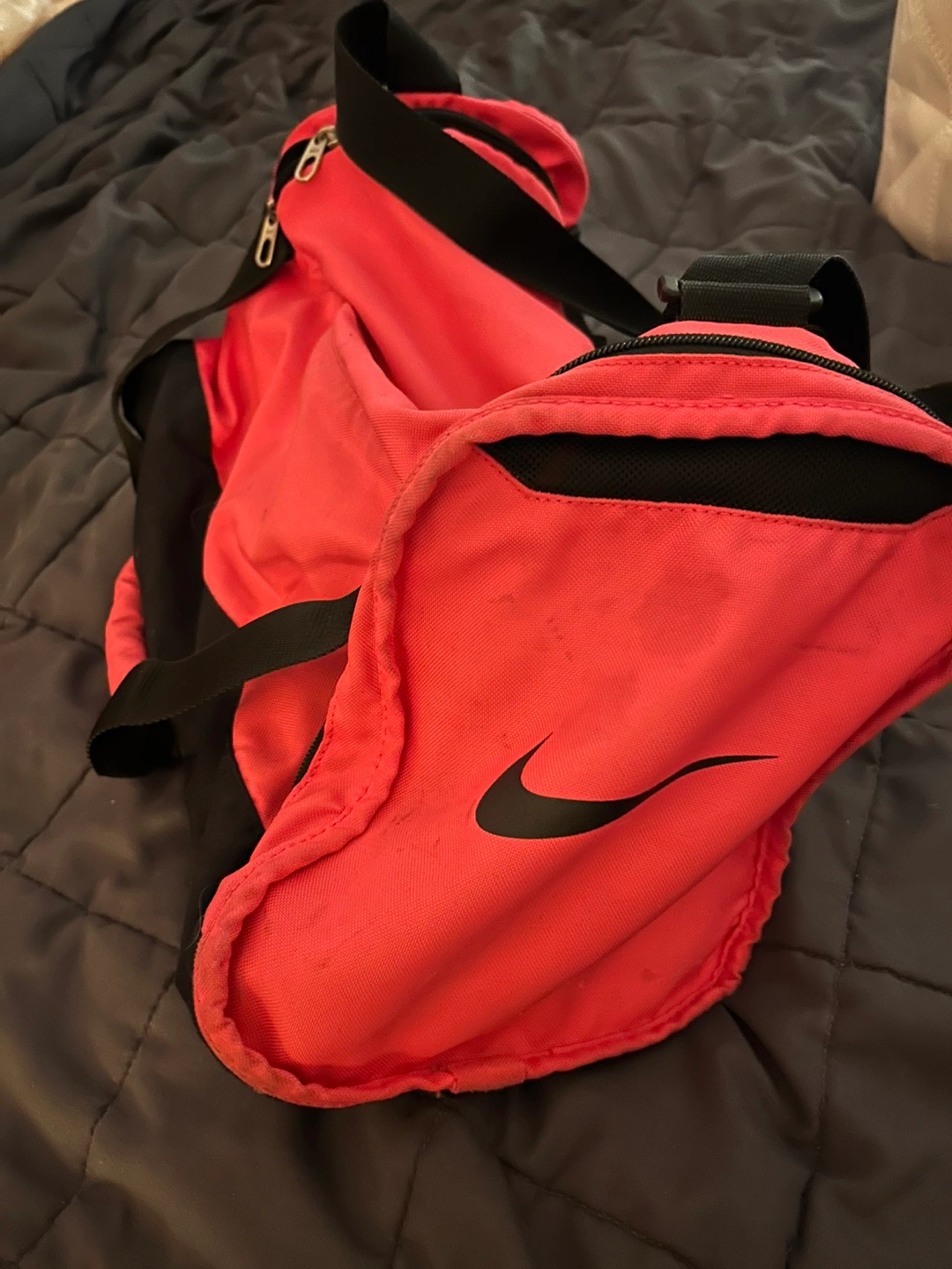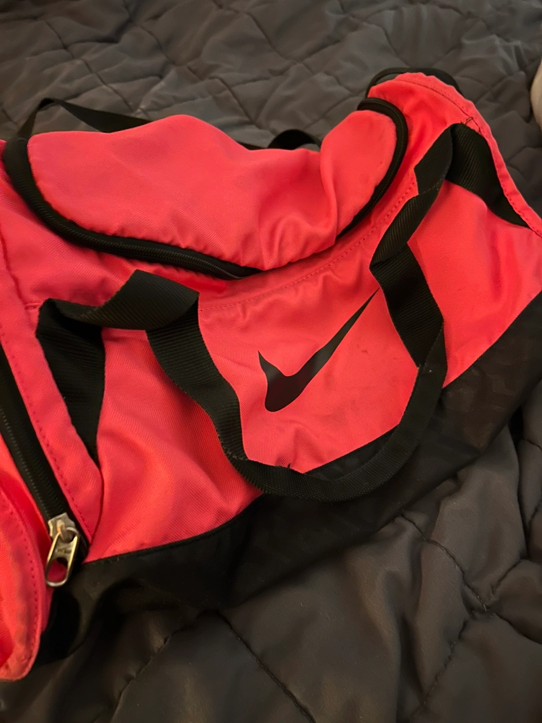 Bright Pink and black Nike duffel bag. Features a main zippered compartment and an exterior zippered pocket. This bag's a good size for gym clothes or weekend trips!