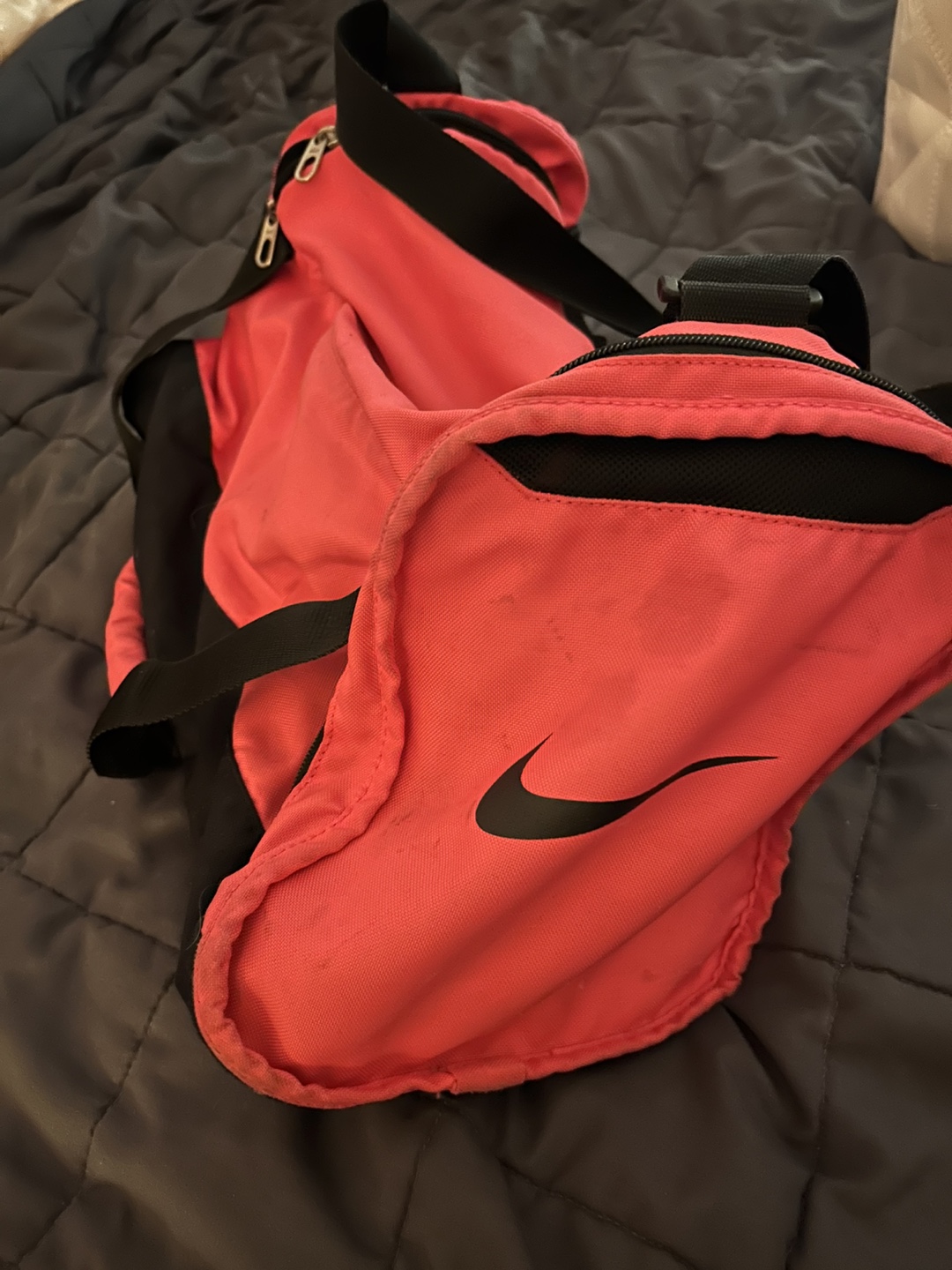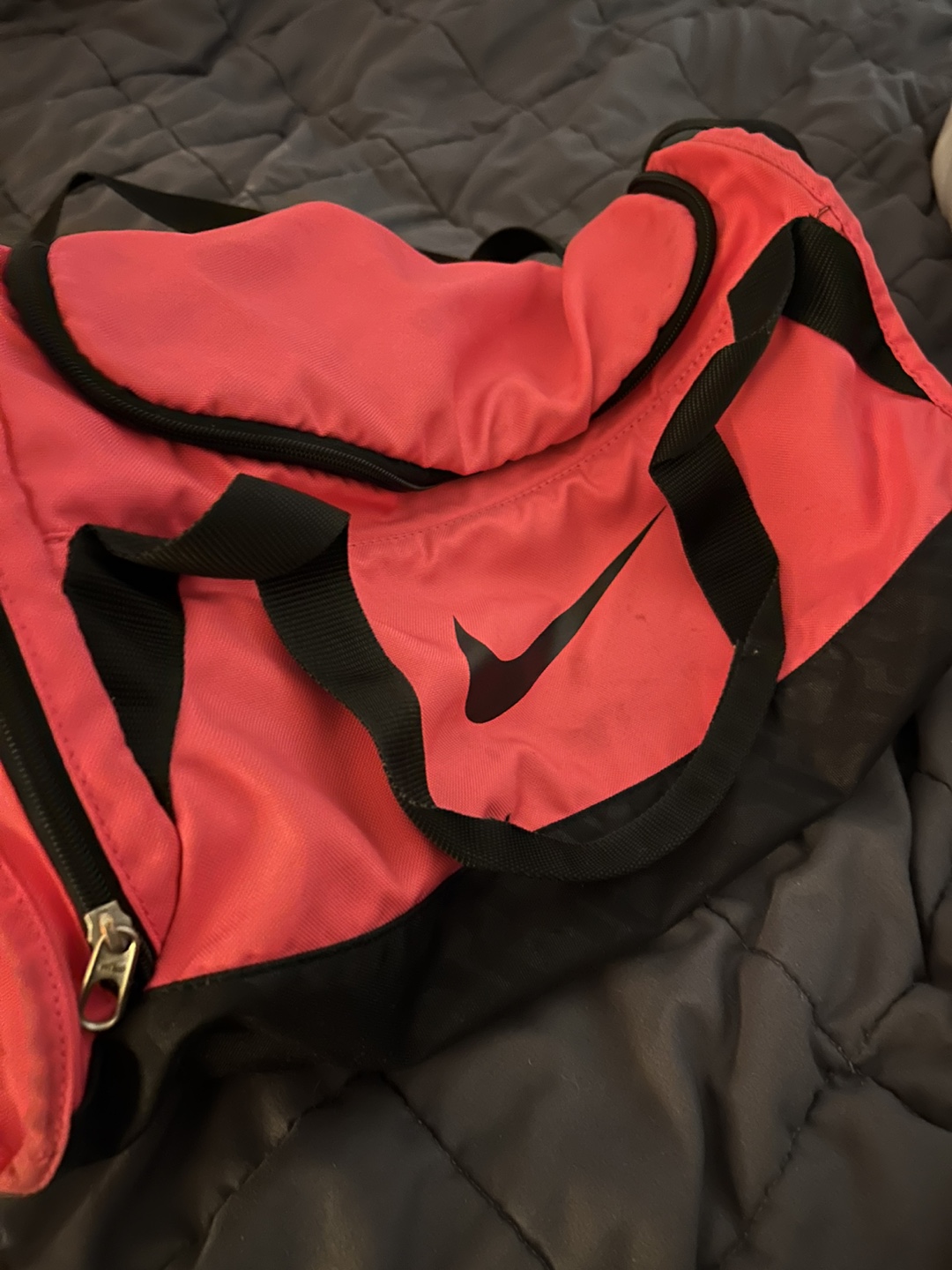 Bright Pink and black Nike duffel bag. Features a main zippered compartment and an exterior zippered pocket. This bag's a good size for gym clothes or weekend trips!