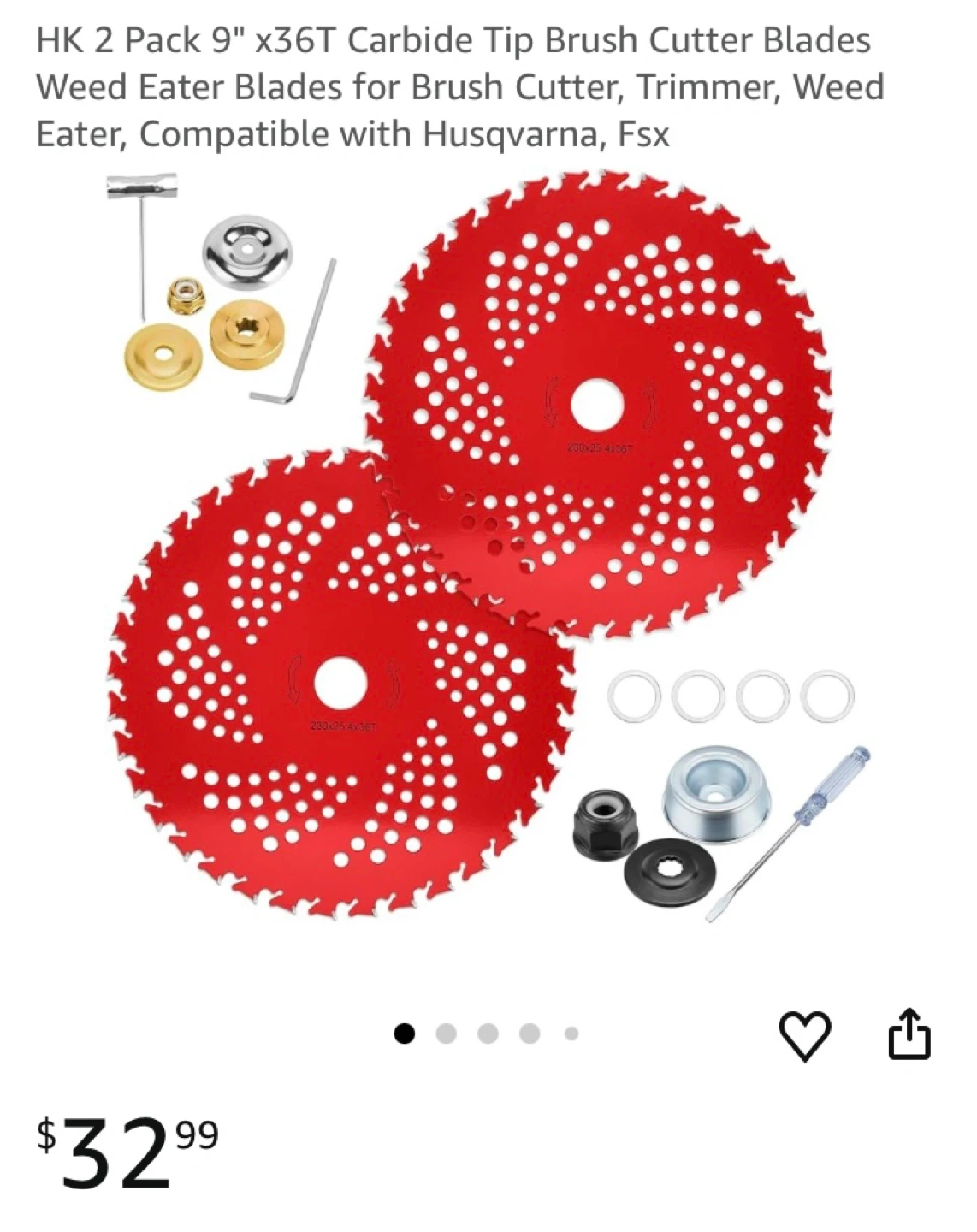 Set of brush cutter blades in various tooth counts. Includes different blade styles and a mounting kit. Blades are red and black.