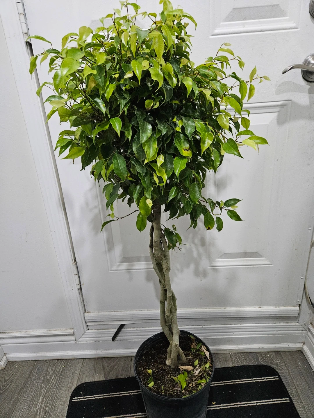 A lovely braided ficus tree in a pot. It's a beautiful green houseplant that brings a touch of nature indoors. It's great for brightening up any living space!