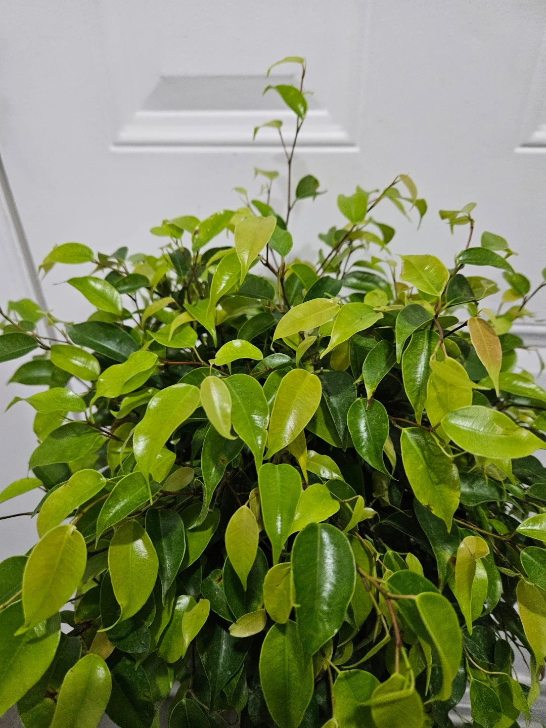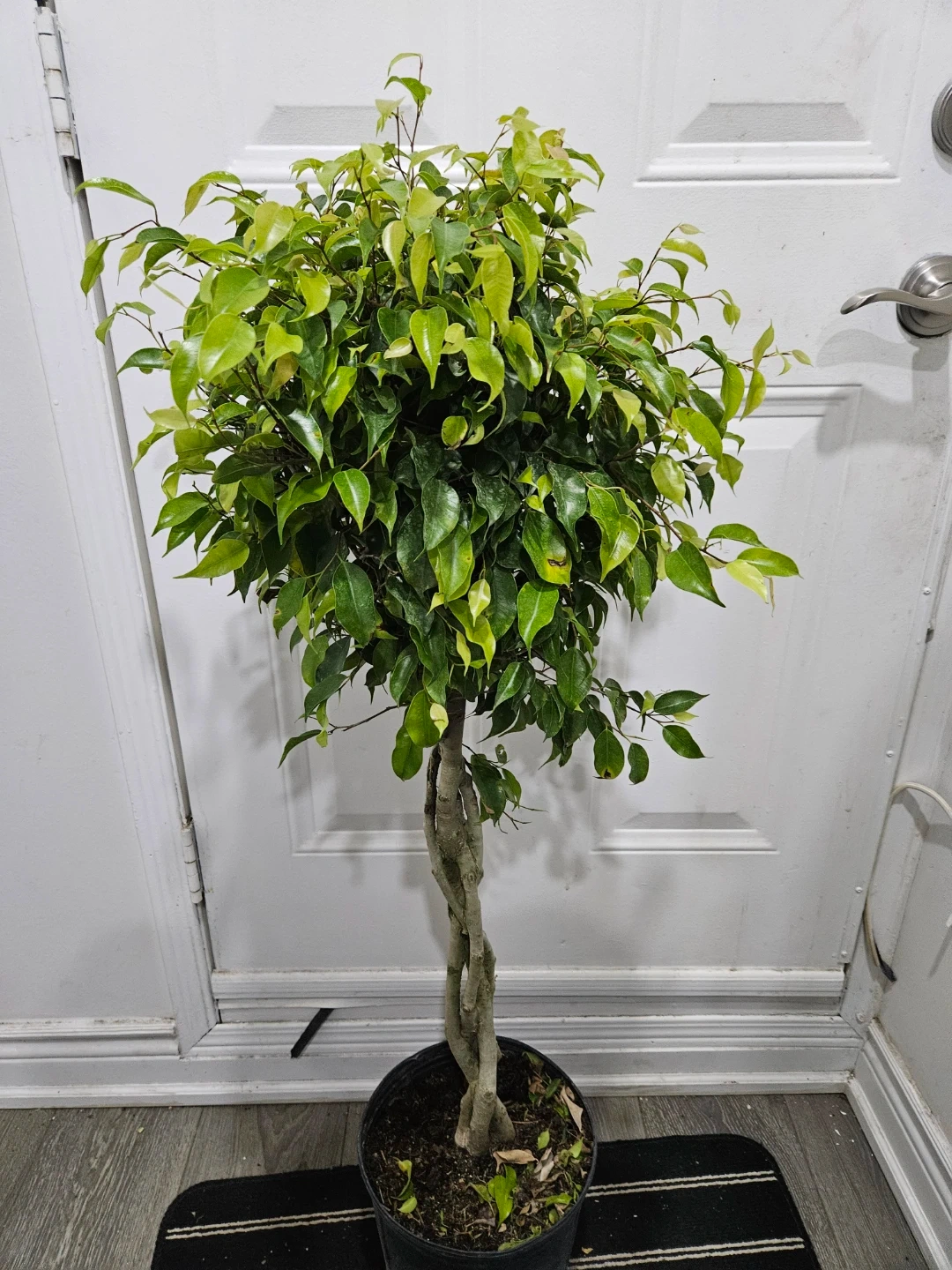 A lovely braided ficus tree in a pot. It's a beautiful green houseplant that brings a touch of nature indoors. It's great for brightening up any living space!