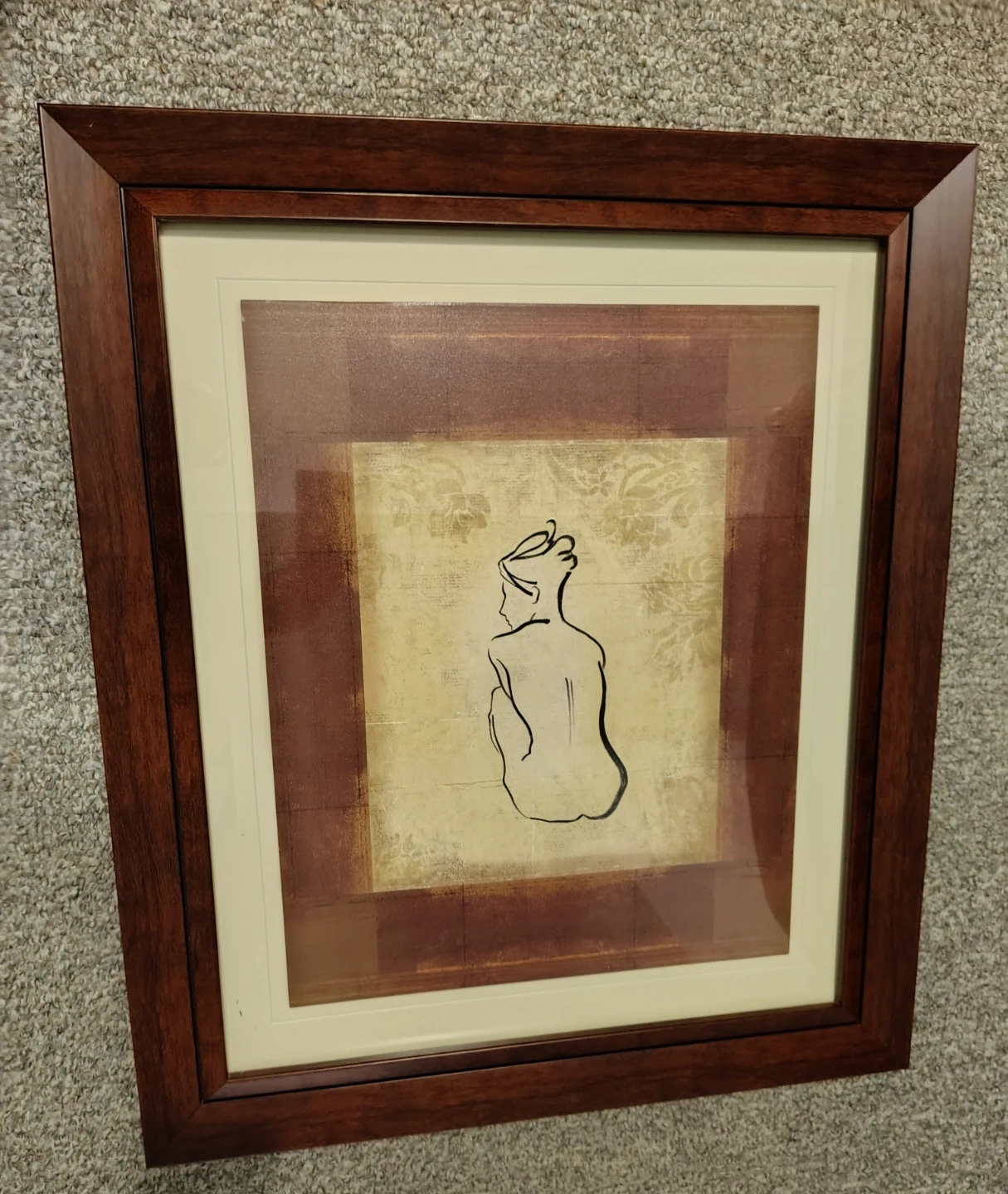 89A framed art print featuring a simple figure sketch. The frame is a dark wood tone, and the artwork has a neutral colour palette. It's in great shape and ready to add a touch of elegance to your home!