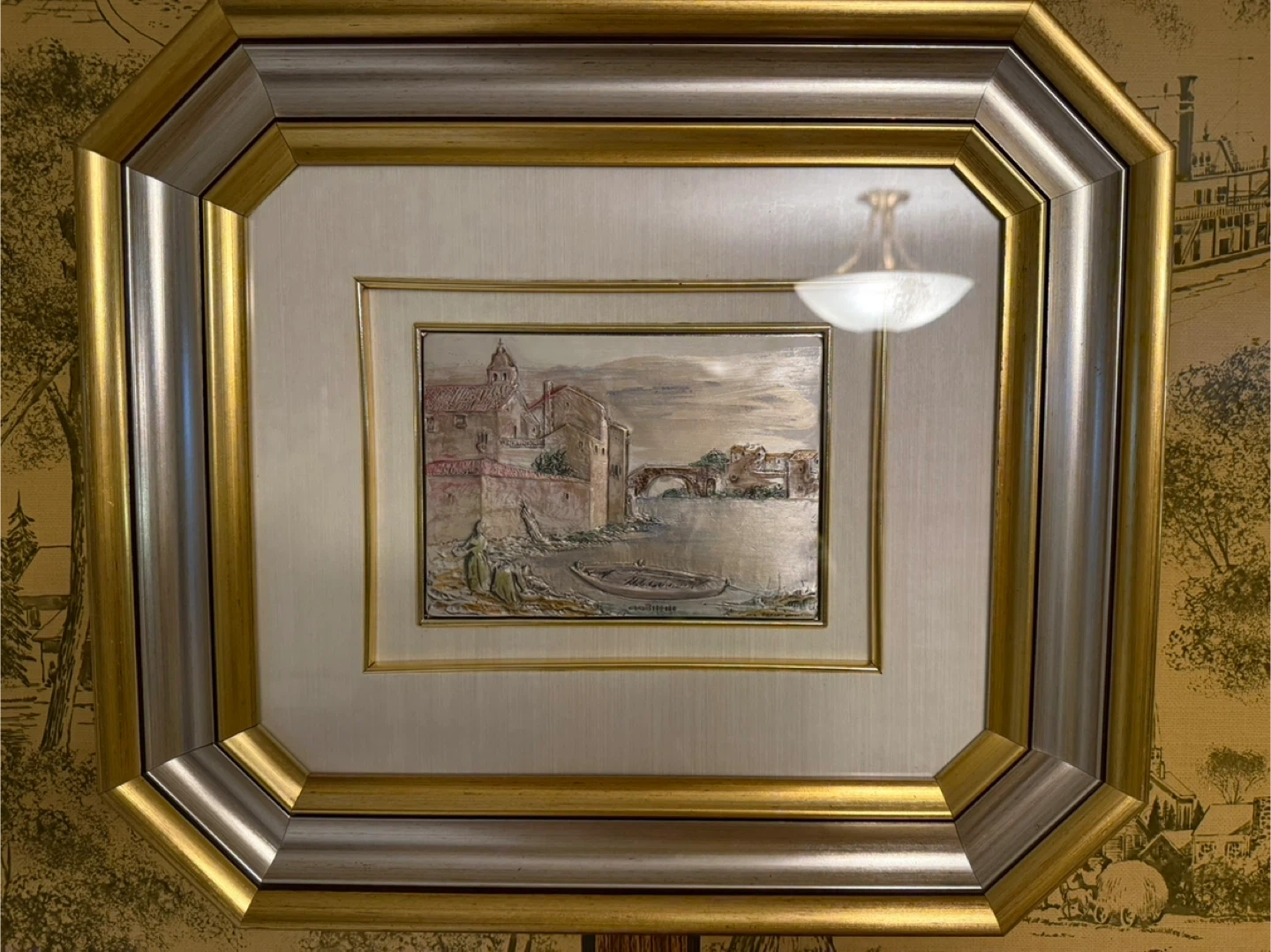 A framed piece of art is up for grabs! The frame is a mix of gold and silver tones, adding a touch of elegance to the artwork itself. It looks like a scenic view of a town by the water. Perfect for adding a bit of charm to any room