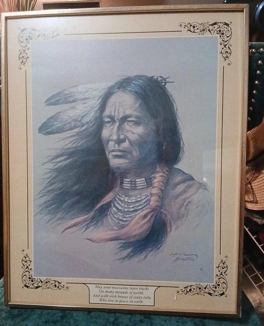 91Framed print by Bill Hampton. The print features a portrait of a Native American man. The frame has decorative corner details. Text at the bottom reads: "May your moccasins leave tracks on many mounds of worth, and walk with braves of every tribe who live in peace on earth"