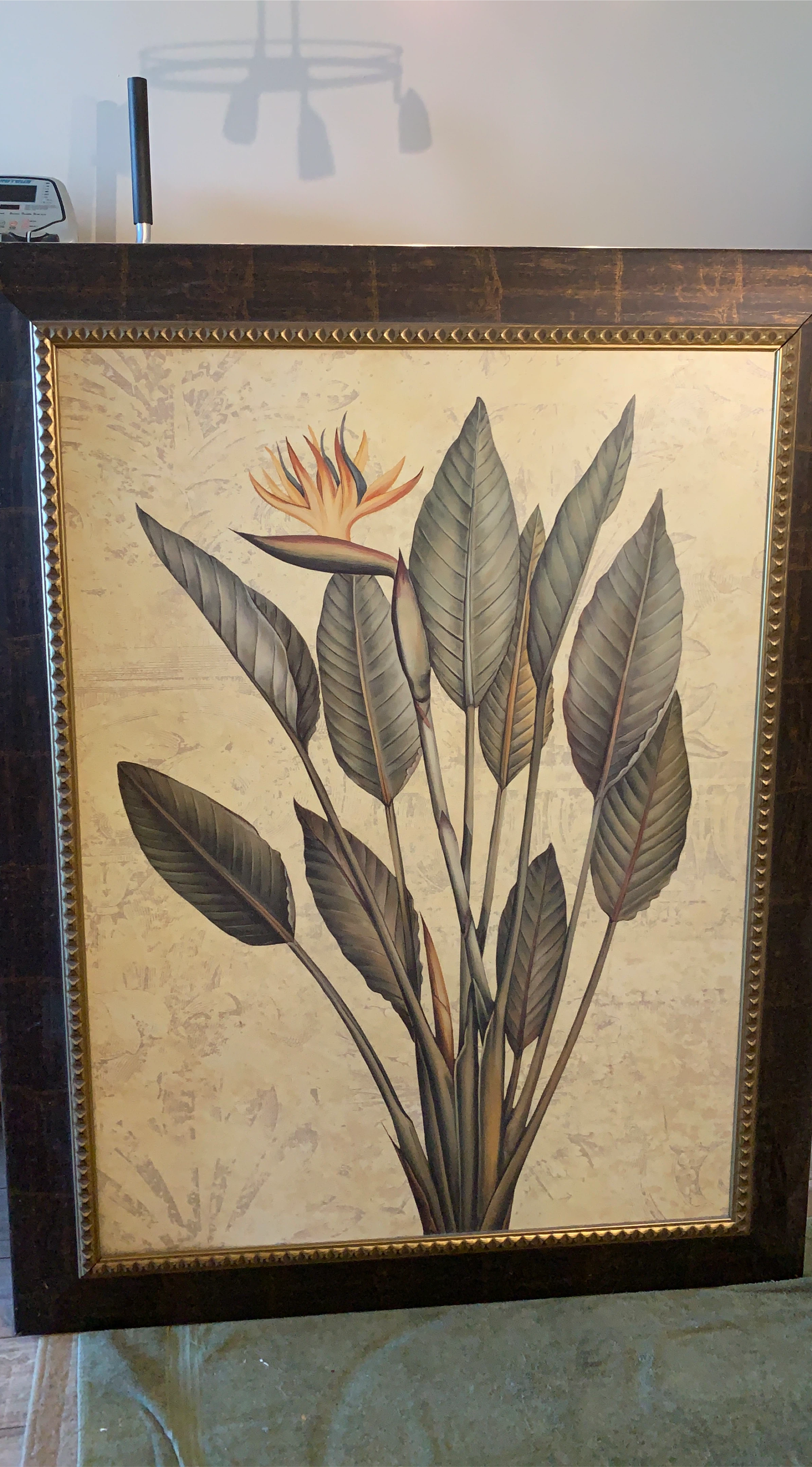 10A framed print featuring a bird of paradise plant. The frame is a dark brown with gold accents. It would look great in any room!