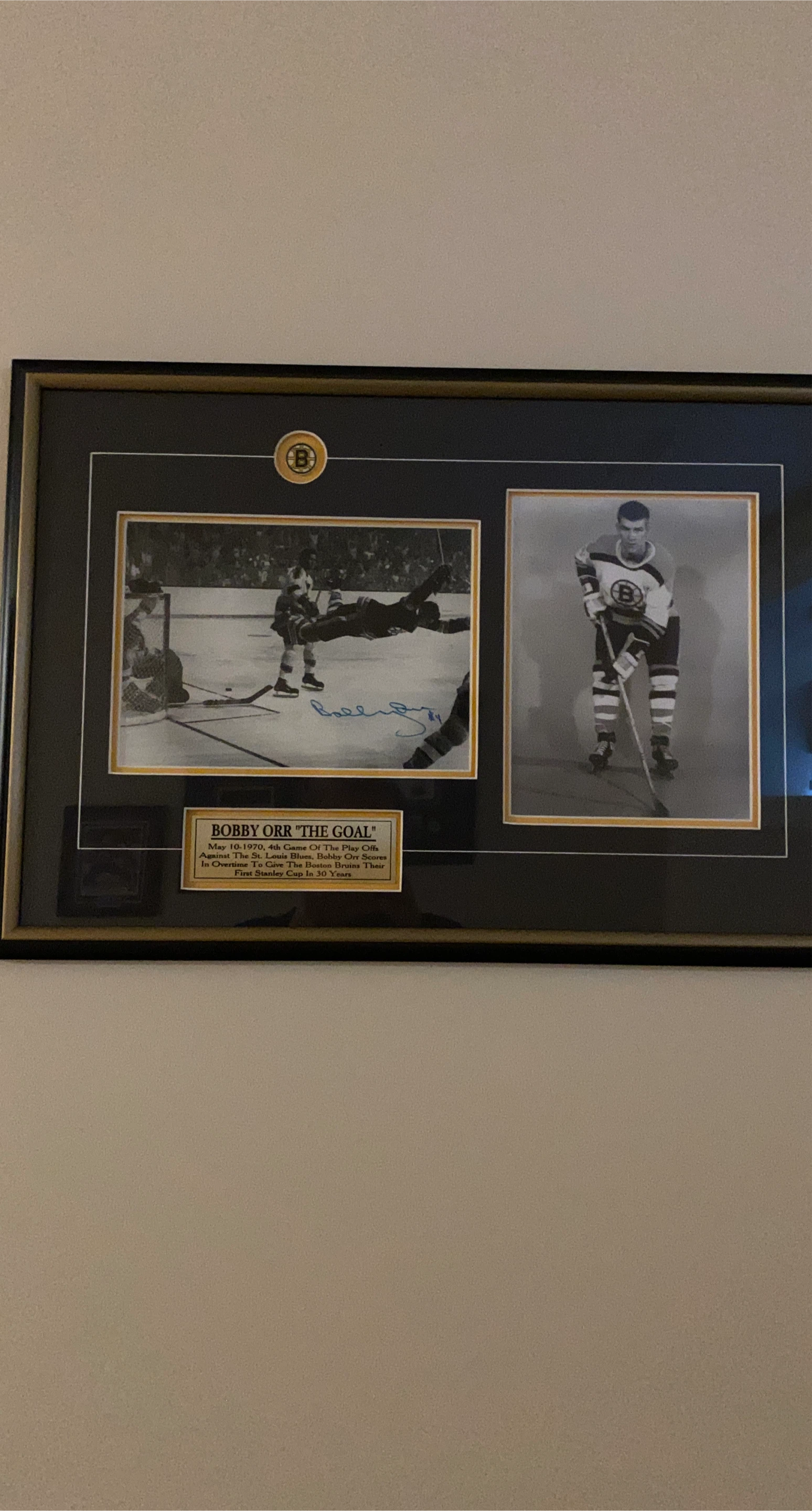 Selling a framed print of Bobby Orr's famous goal. It commemorates the May 10, 1970 game where Orr scored in overtime against the St. Louis Blues, securing the Boston Bruins' first Stanley Cup in 30 years Framed size 17.5”h X 25.5”w.
