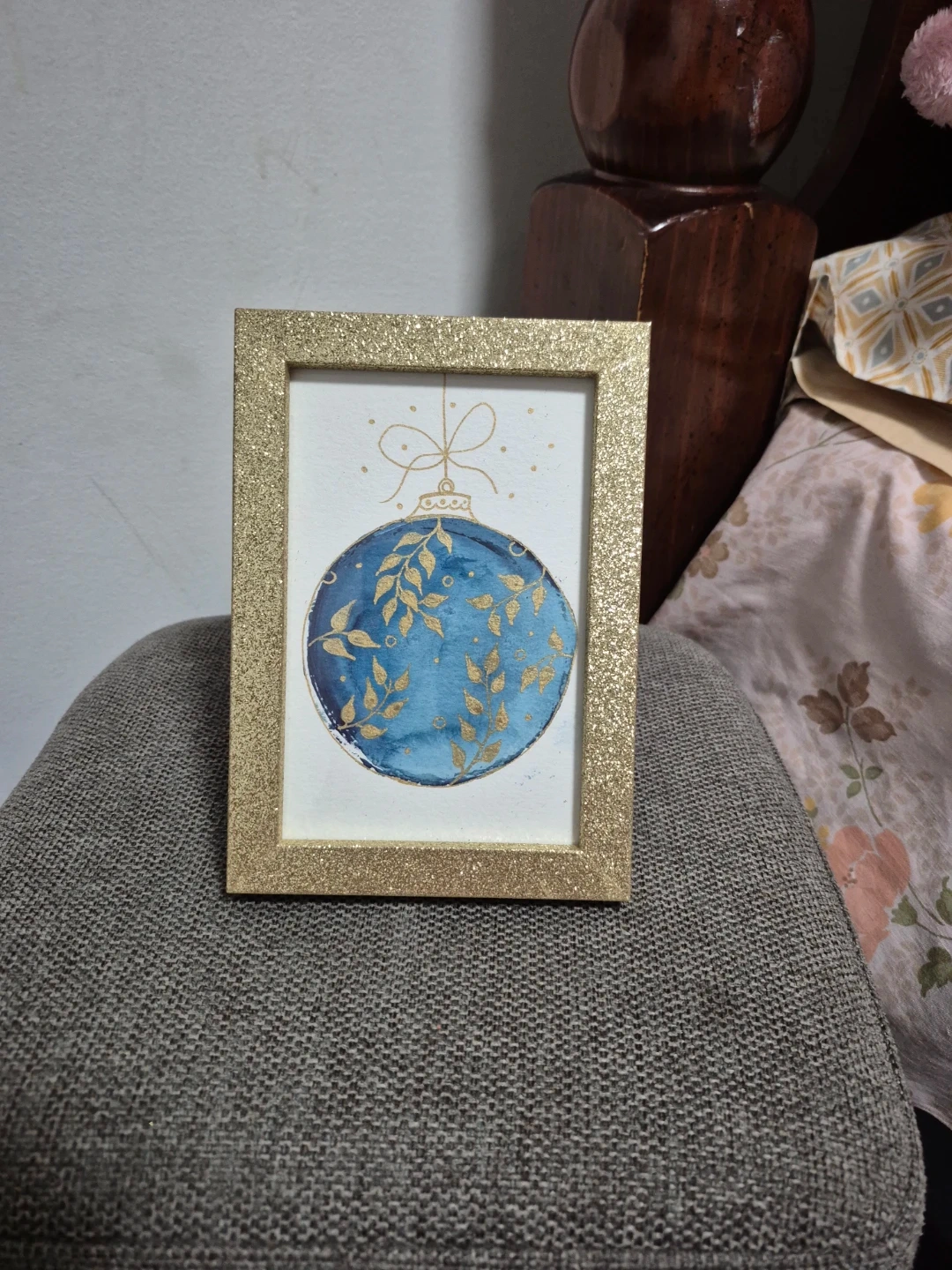 10A lovely framed watercolour painting of a blue and gold Christmas ornament. It's perfect for adding a festive touch to any room!