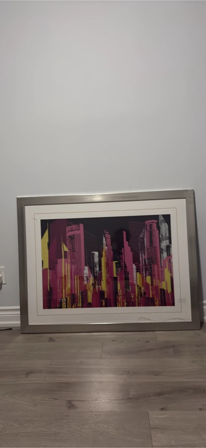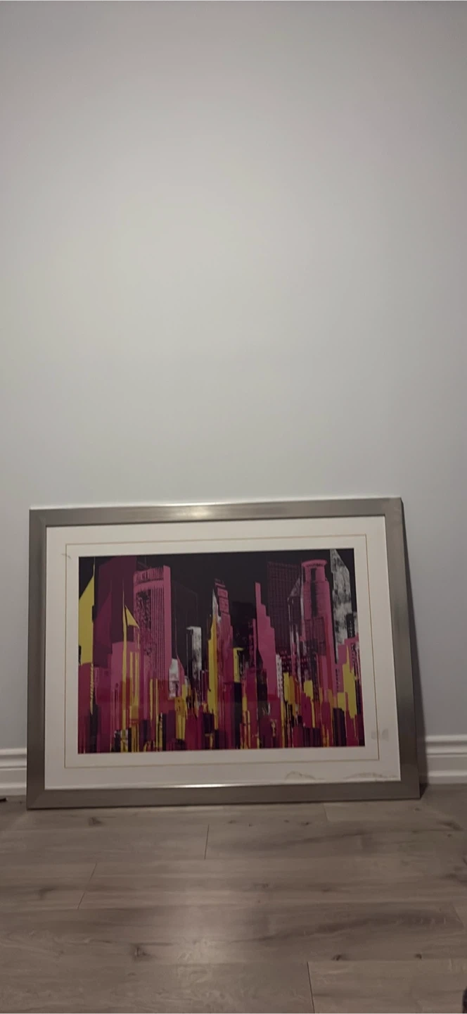 Selling a framed art print featuring a cityscape design in shades of pink, yellow, and black. It's in great condition and ready to add a pop of colour to your space!