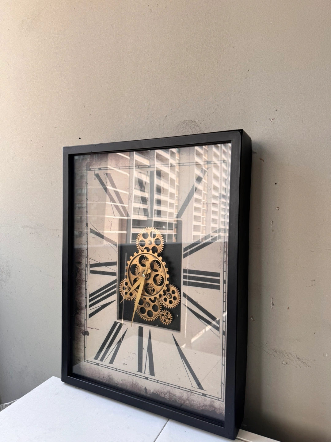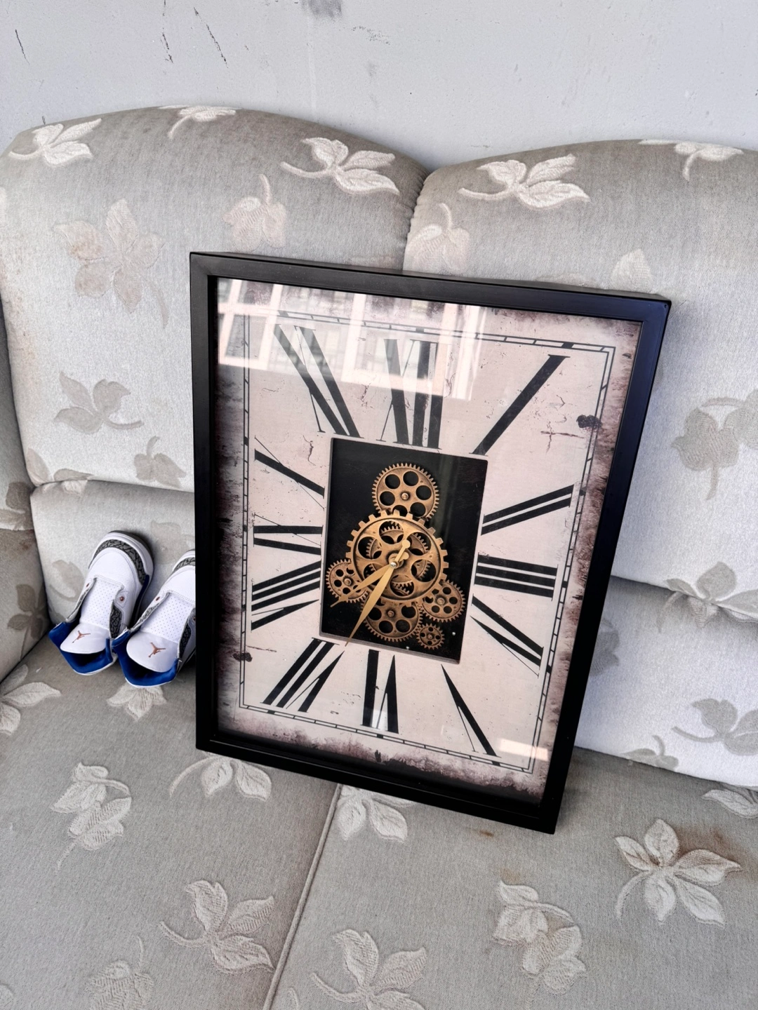 Selling a framed clock with visible gears. It features a black frame and a decorative design with Roman numerals. It would make a nice addition to any room!