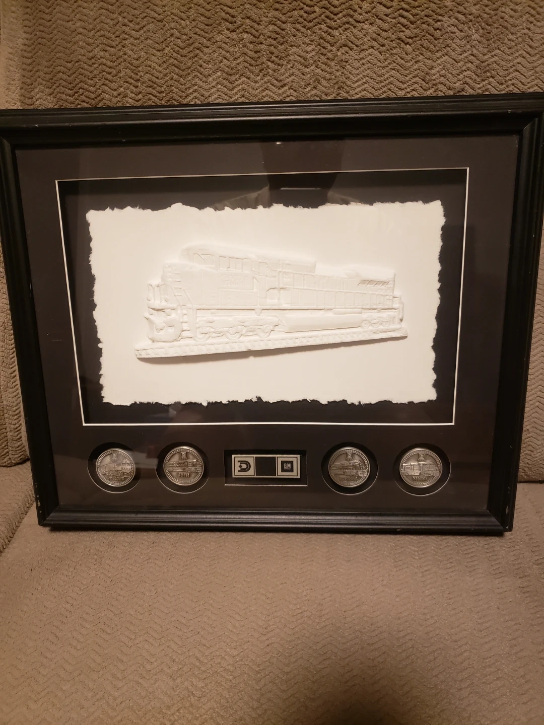 60This is a framed piece of art featuring a relief of a CN Railway locomotive. Below the relief are five commemorative coins. The frame is black. It would make a great addition to any railway enthusiast's collection