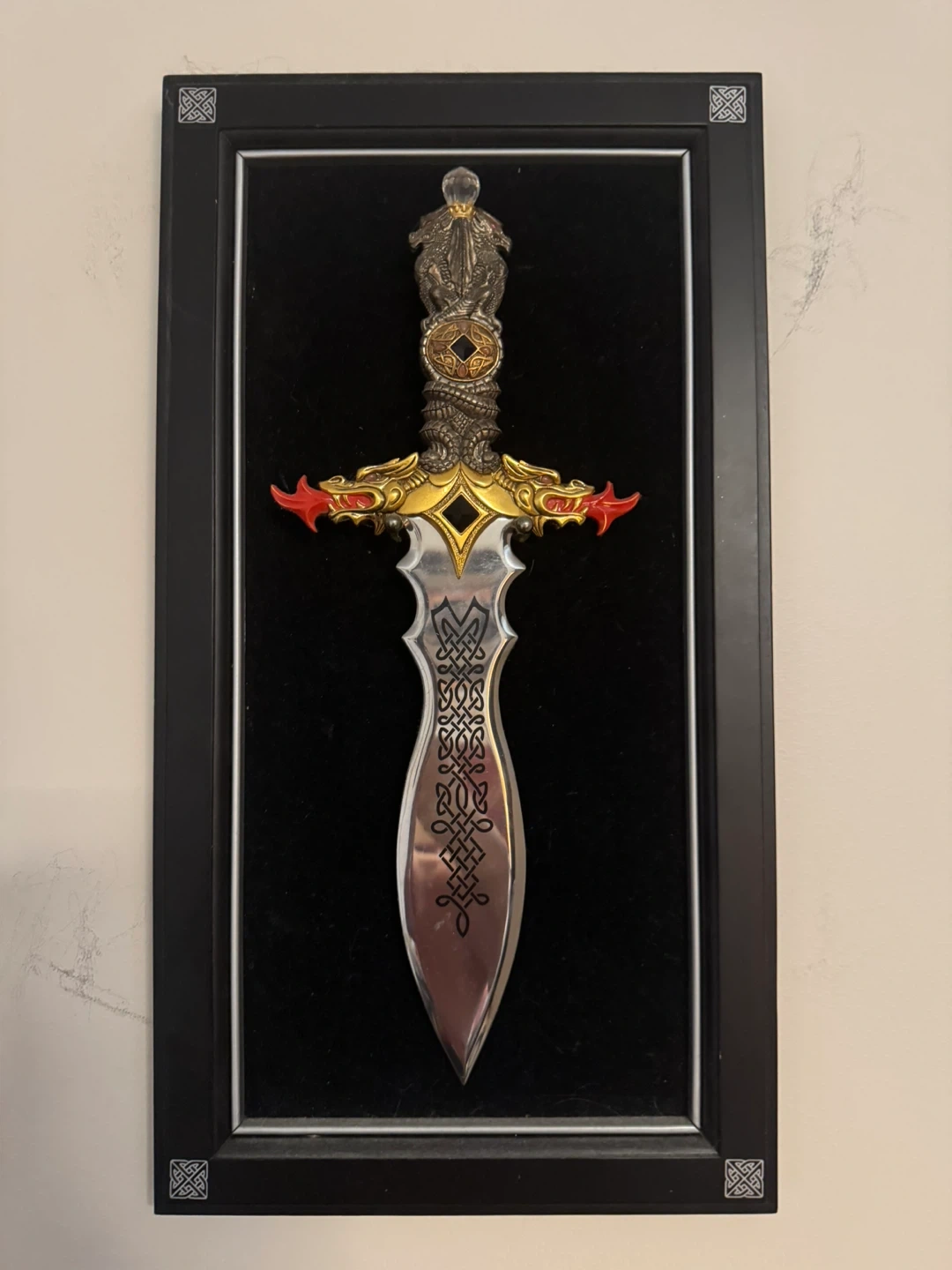 Selling a framed decorative dagger. It features intricate Celtic knot designs on the blade and a dragon-themed handle with red accents. The dagger is mounted on a black velvet background within a black frame. It would make a unique addition to any collection or a striking piece of wall decor