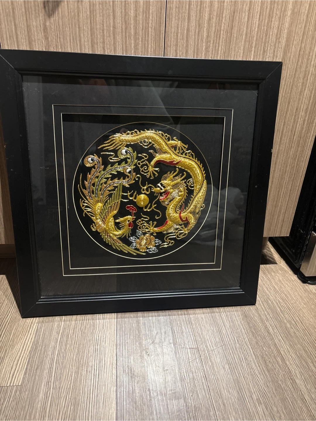 60Beautifully framed silk, hand embroidered featuring a golden dragon and phoenix design! This piece would add a touch of elegance to any room *Estate sale. Everything must go*