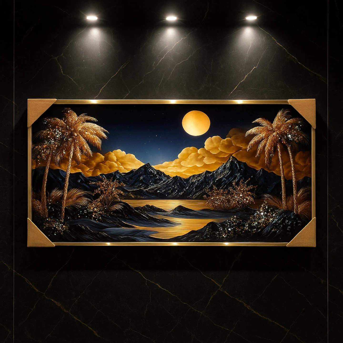 15This framed landscape art piece features a beautiful scene with palm trees, mountains, and a golden moon. It's perfect for adding a touch of elegance to any room in your home or office. The frame complements the artwork, creating a cohesive and eye-catching display