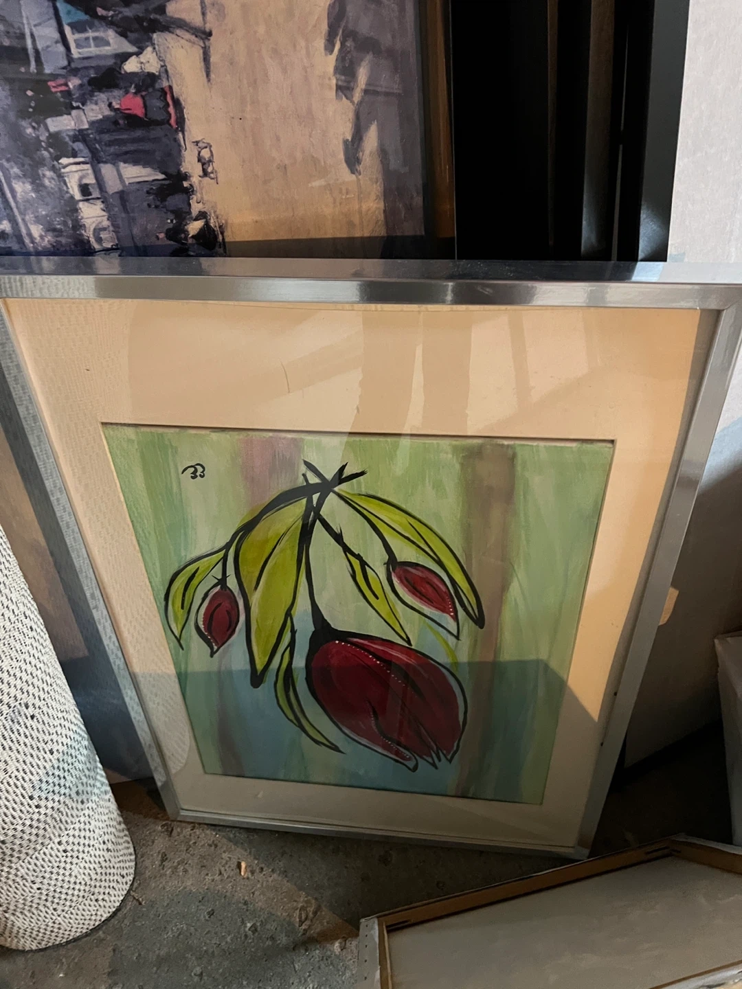 784Selling a framed painting with a floral design. It's in good condition and ready to brighten up any room. The frame is a simple silver colour.