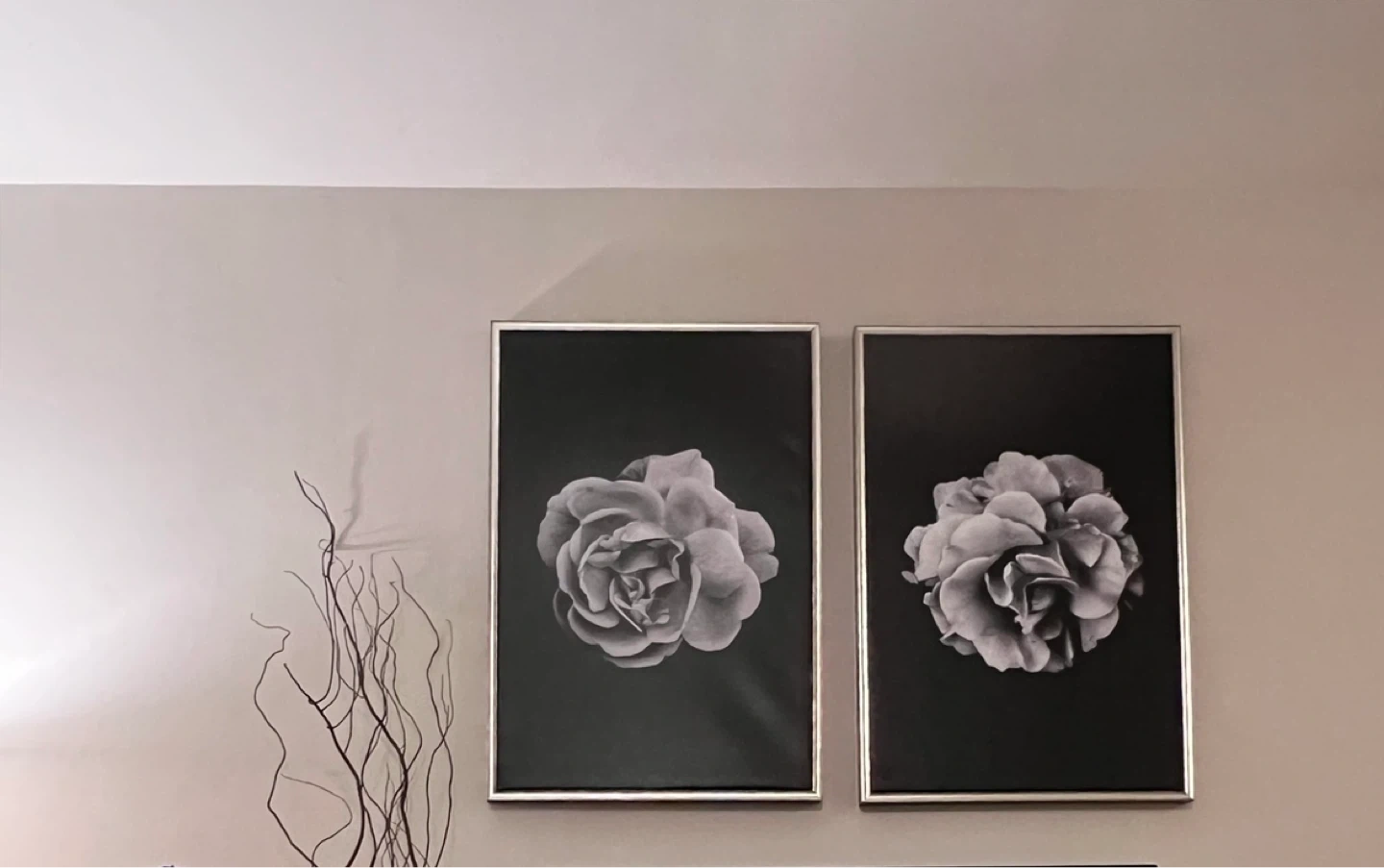 62Selling a set of two framed floral prints. They feature a black and white floral design with silver frames. Perfect for adding a touch of elegance to any room
