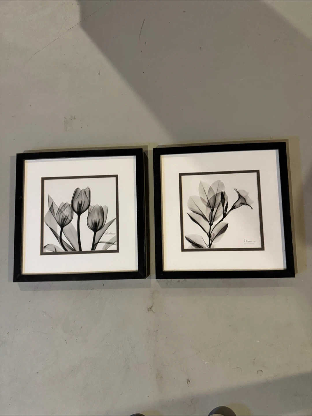 62Selling a set of two framed flower prints. These black and white prints feature botanical designs and would look great in any room. The frames are black and in good condition. Perfect for adding a touch of elegance to your home decor!