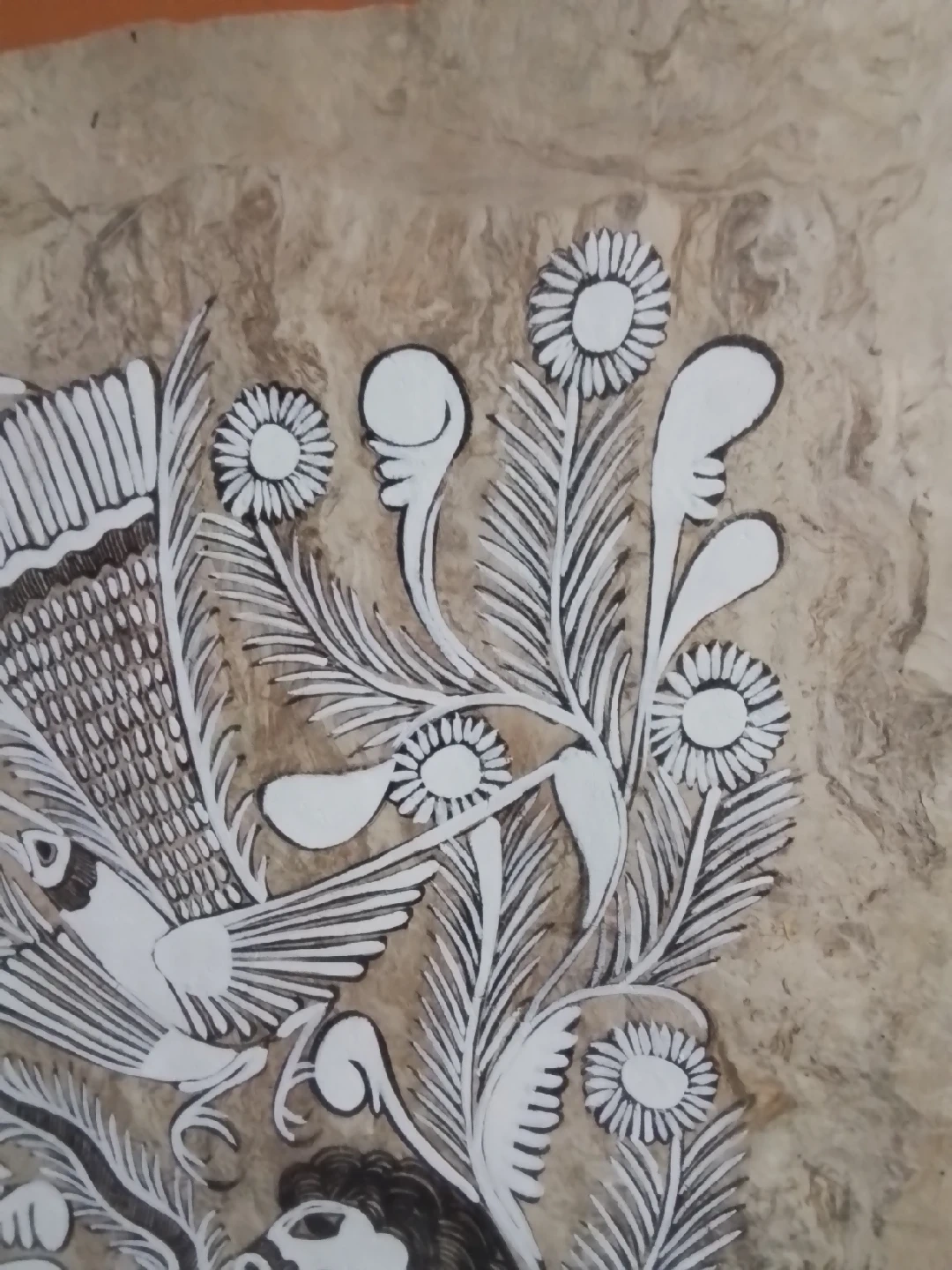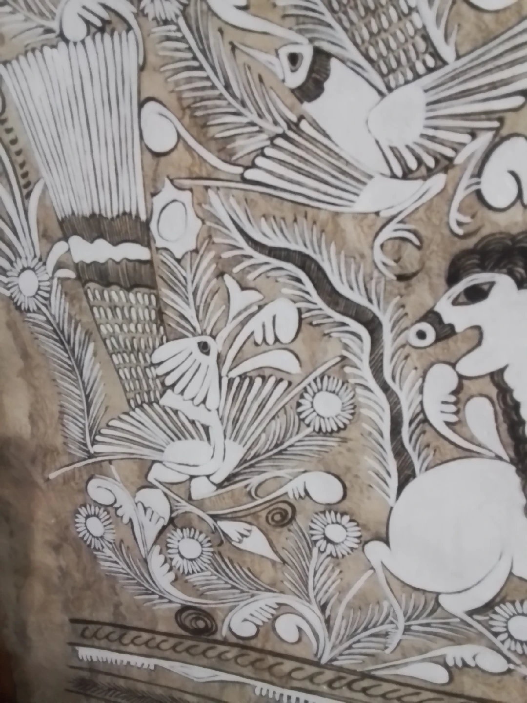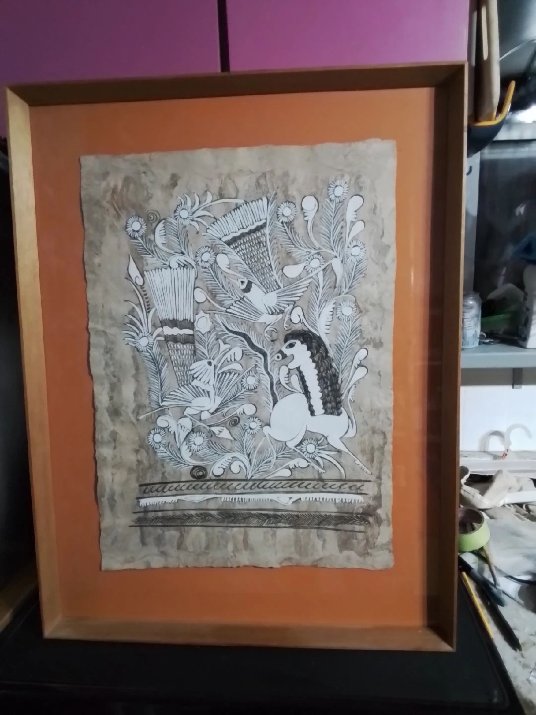 114Framed Folk Art Drawing Unique framed drawing featuring birds, flowers, and a mythological creature. The artwork is done in black and white on a textured background. Perfect for adding a touch of folk art to your home decor Artwork on bark pepper 24.5 x 31. 75" This is a unique artwork on bark pepper, measuring 24.5 x 31.75 inches, featuring intricate designs. The piece is in good condition, showcasing a blend of traditional and natural elements. It's framed and ready to hang, adding a touch of cultural artistry to any space. * Material: Bark Pepper * Dimensions: 24.5 x 31.75 inches * Condition: Good * Framed: Yes Looking at similar art pieces listed on Kijiji, a reasonable price for this unique item would be around $150. Because of the good condition, I've priced it at the higher end of the estimated value. If you're reading this, it's still available! Don't miss out on the chance to own this captivating piece of art. Pickup at Yonge Street and Steels Avenue