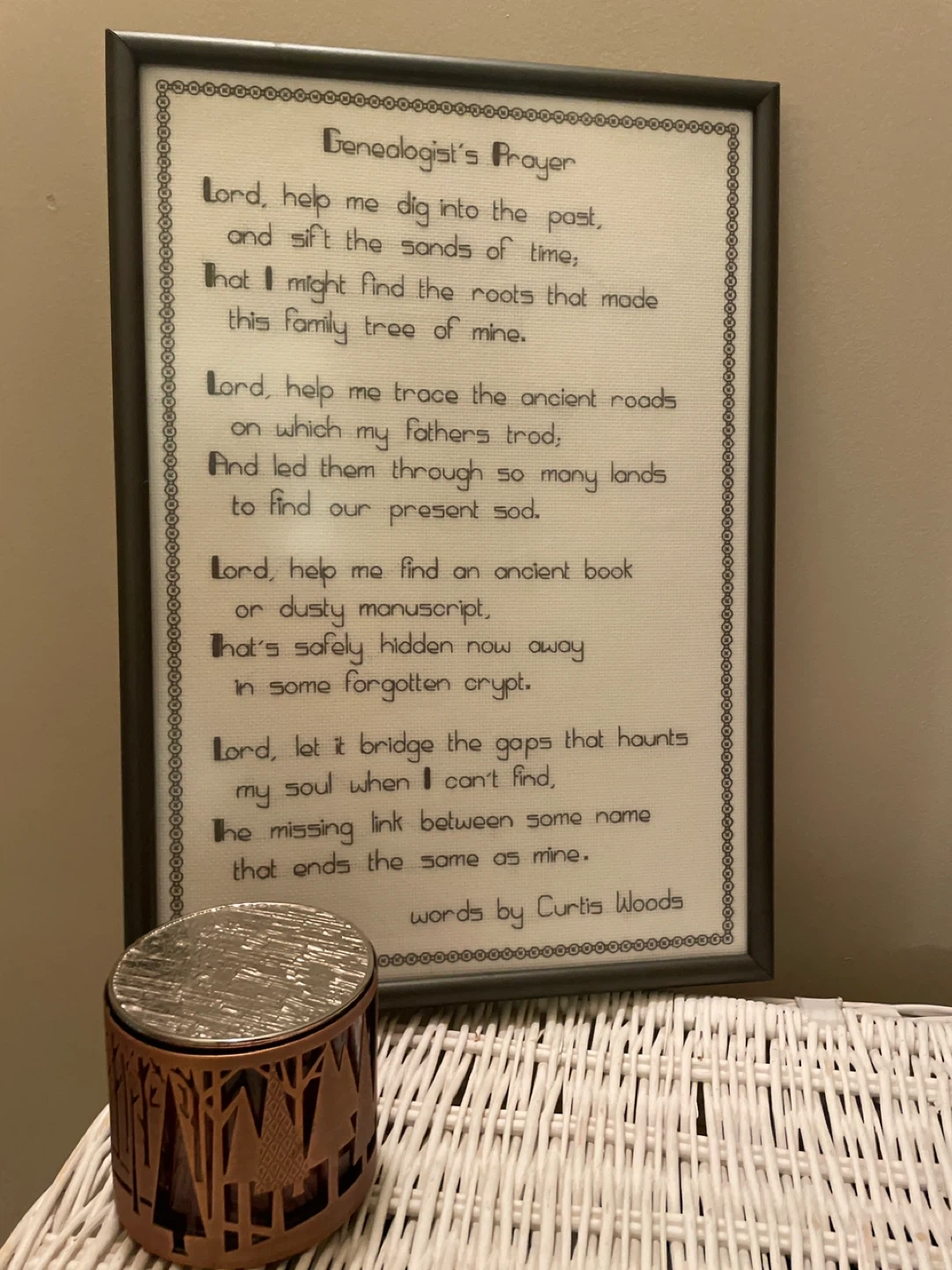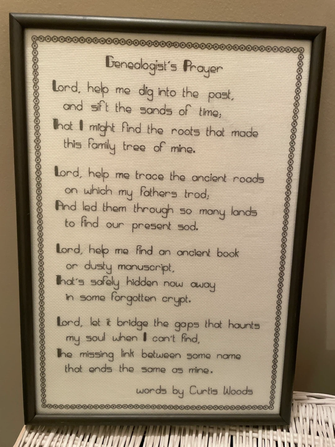 A framed cross-stitch piece featuring the Genealogist's Prayer. It's a lovely piece of needlework with a heartfelt message. Perfect for anyone interested in genealogy or family history!