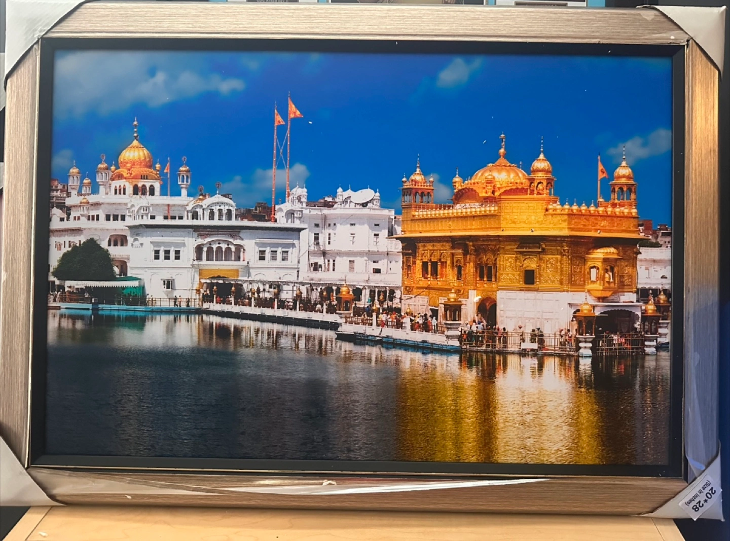 Beautiful framed print of the Golden Temple in Amritsar, India. Features stunning detail and vibrant colours. Silver-toned frame. Perfect for home décor.