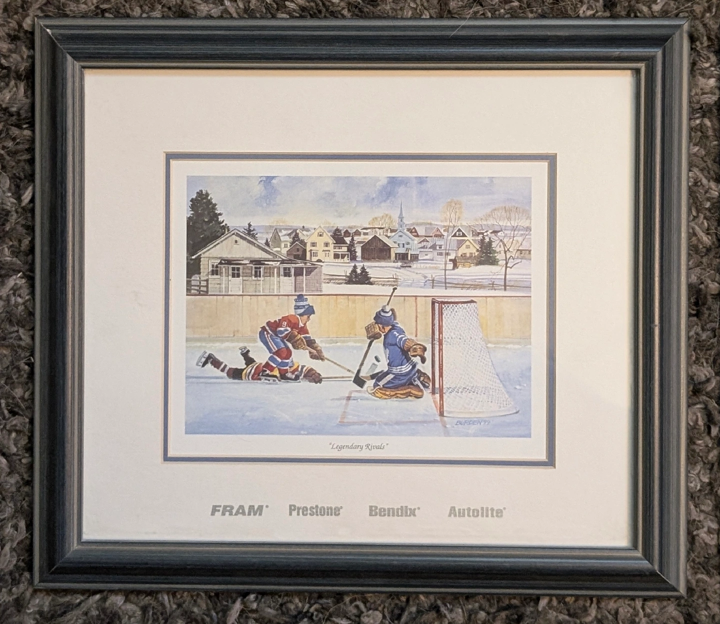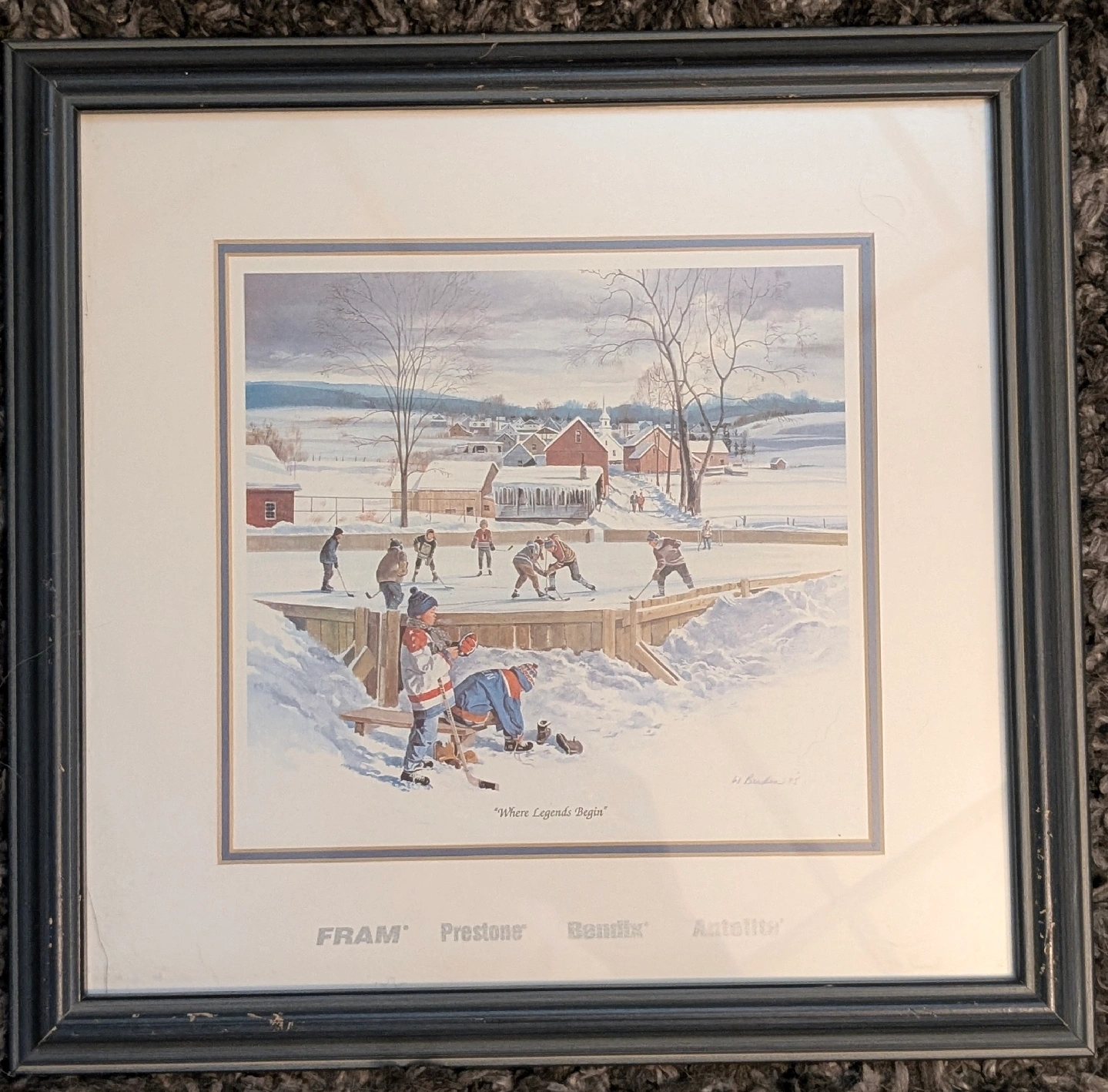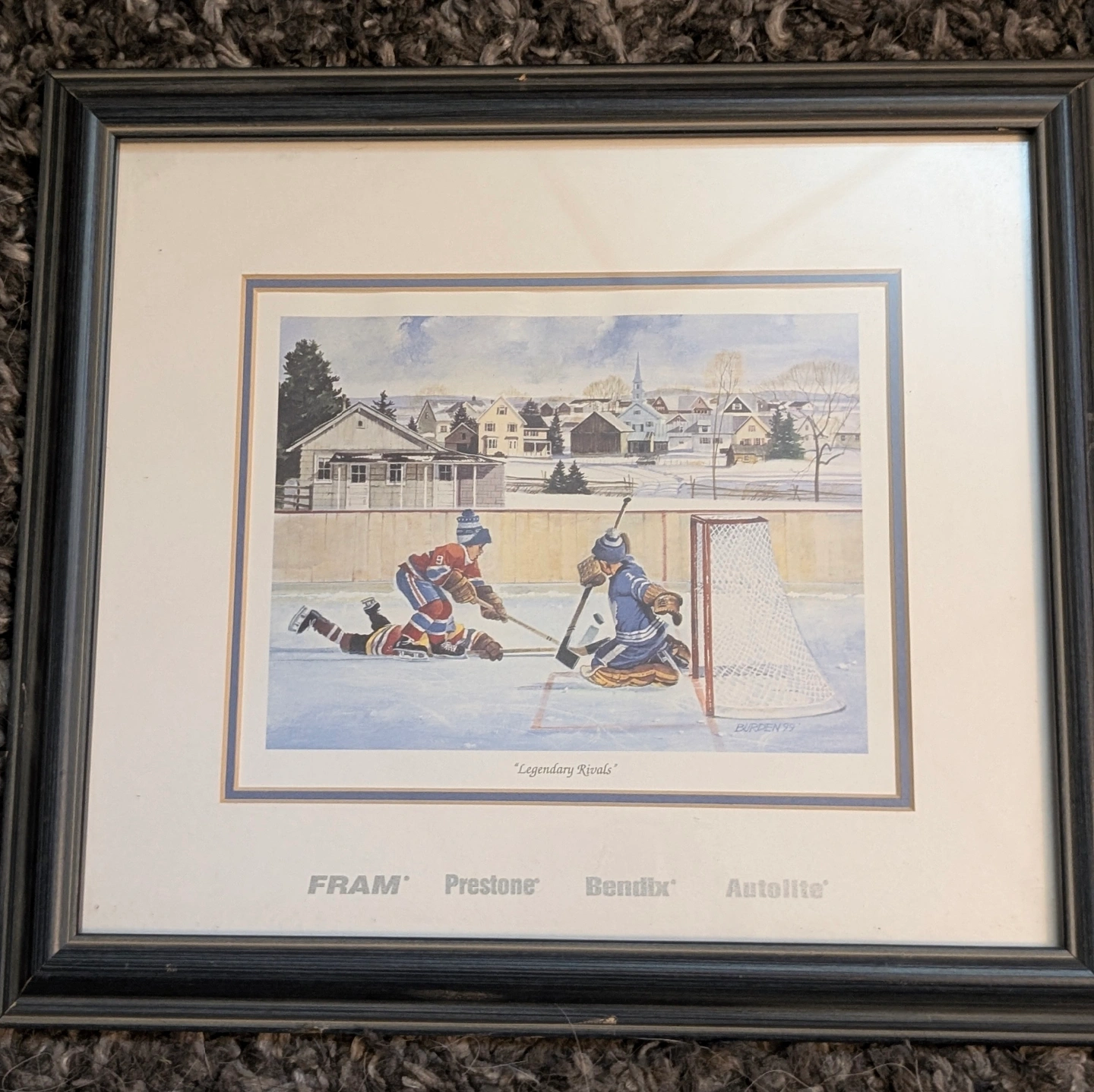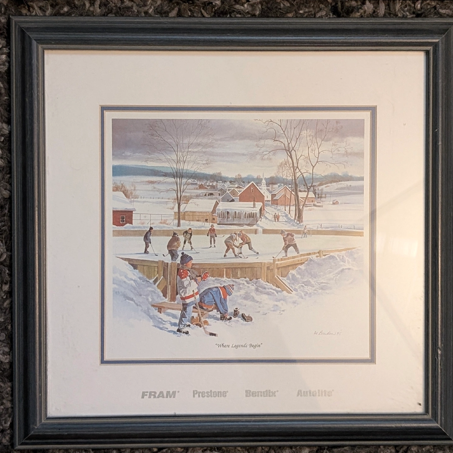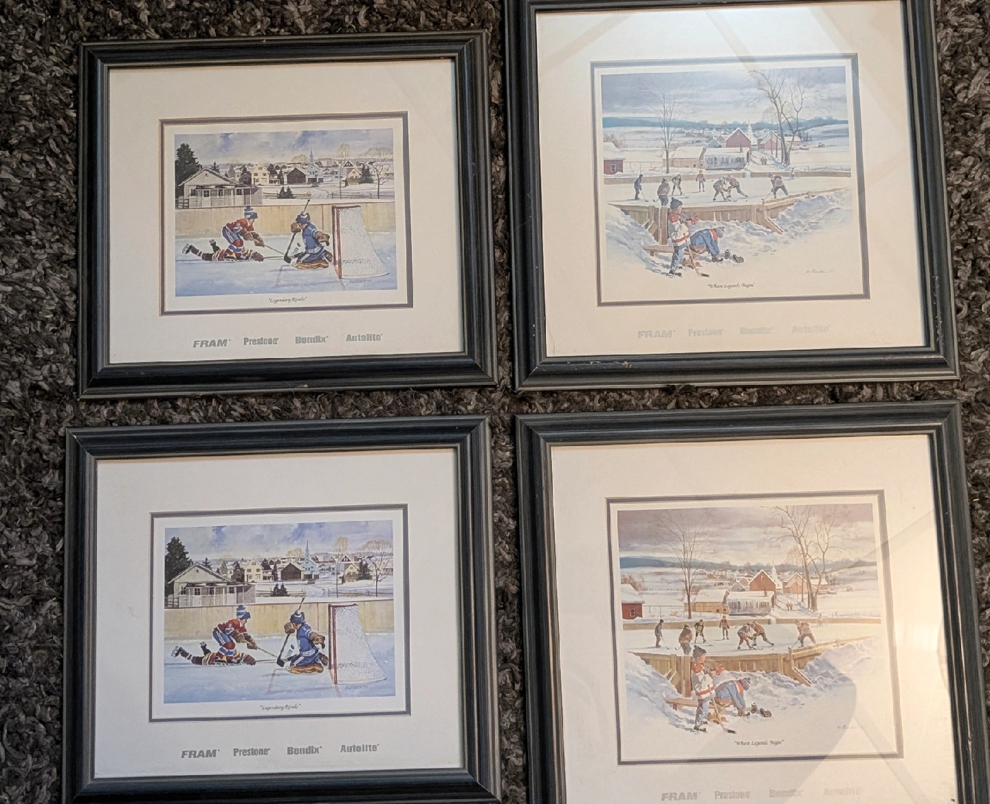 Selling a set of four framed hockey art prints. Each print features a winter hockey scene. The prints are framed and ready to hang. They are branded with FRAM, Prestone, Bendix, and Autolite. artist Walter Burden