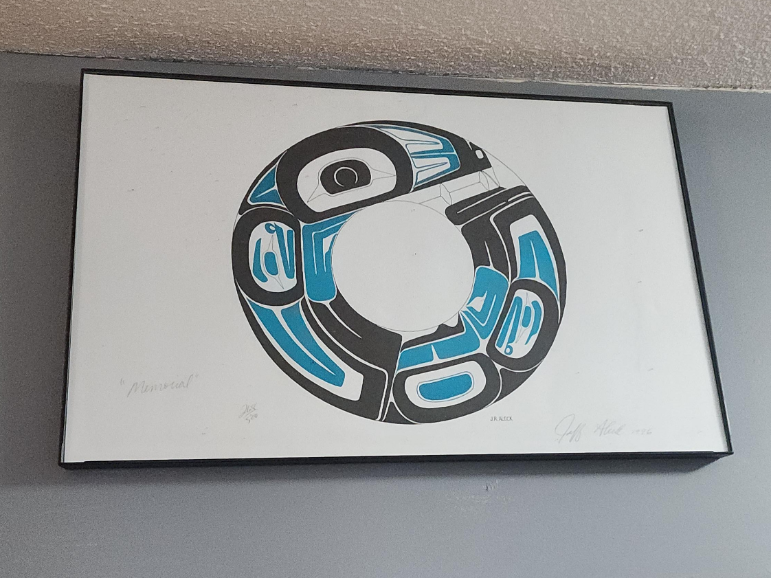 83Framed art print featuring an Indigenous design. The print is titled "Memorial" and signed by J.R. Aleck and Jeff Abbott.
