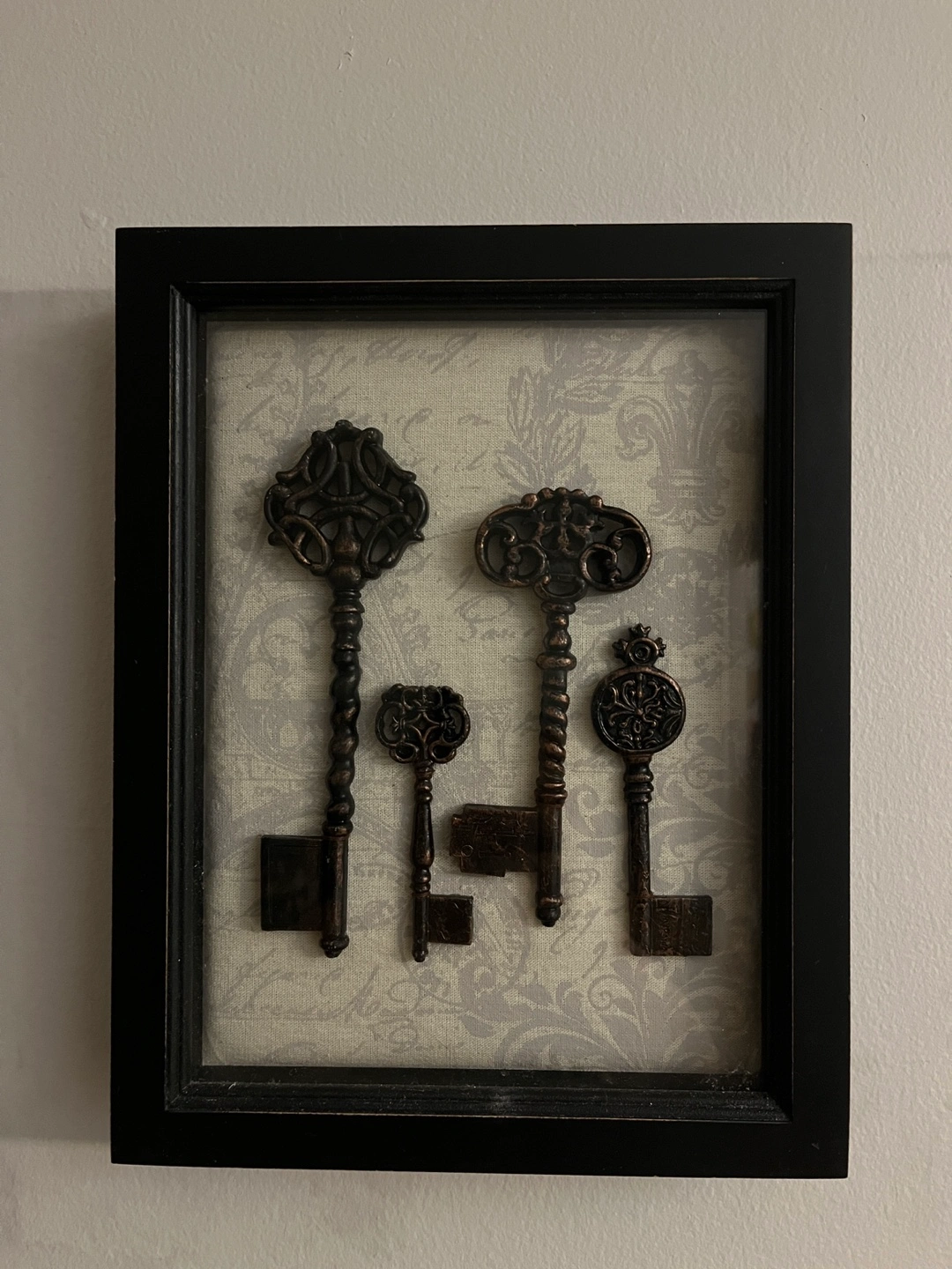 A framed piece of art featuring decorative keys. The frame is black and the keys have an antique look. It's ready to hang and add a touch of vintage charm to any room Sale 🔥