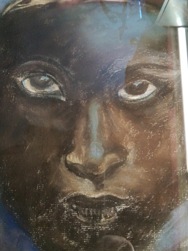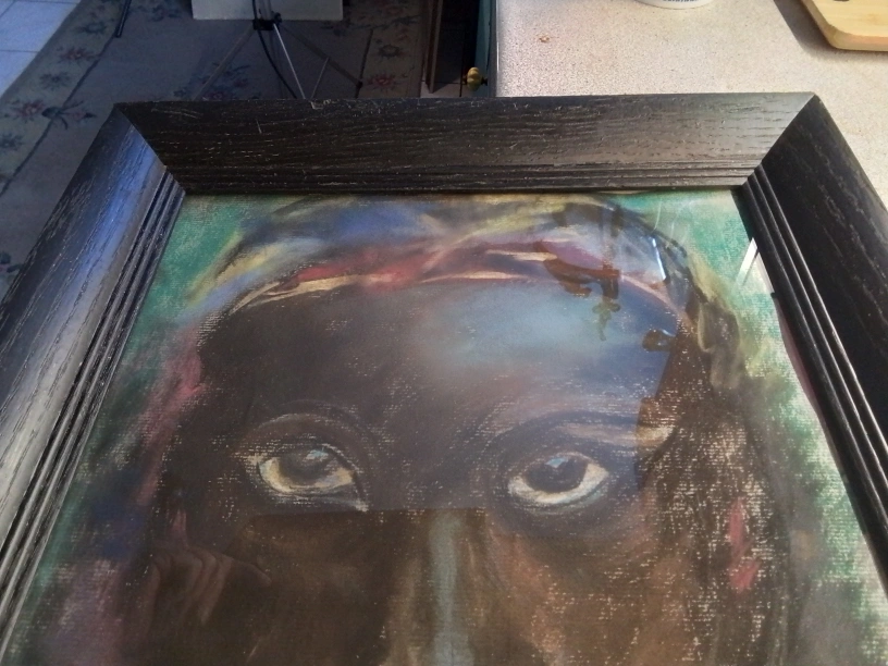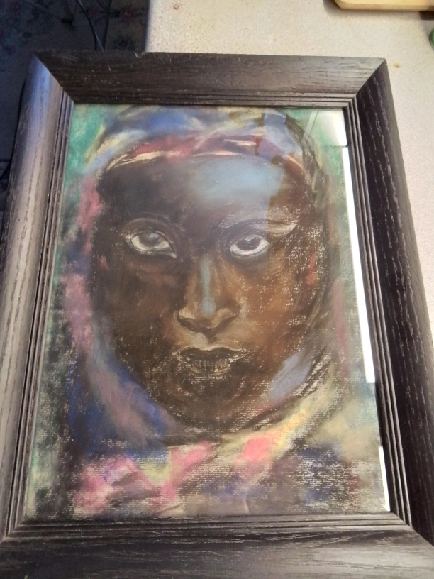 114Framed Lady With Poignant Gaze Pastel Painting 18" Framed pastel drawing. Dark colours. Person's face. Dark wooden frame. Under glass. No Issues Measurements: 18.5" x 14.5" painting 16" x 12" Pickup at Young Street and Steels Ave