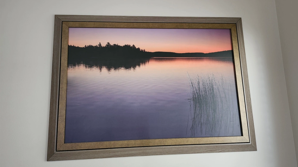 479Selling a framed print of a lake scene. It has a grey wood-look frame with a gold accent. There is a small scratch on the frame as shown in the pictures 42 inches long by 36 inches tall