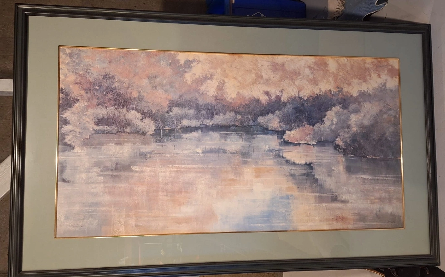 101Large Framed Landscape Art Print Soft pastel river/trees scene in muted blues & peach. Professionally matted (sage with gold trim) and framed under glass. Size 58.5" x 36" $50 OBO, pickup in Hazeldean