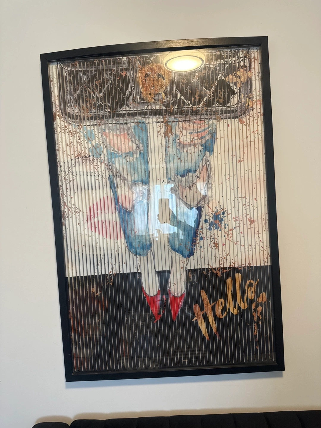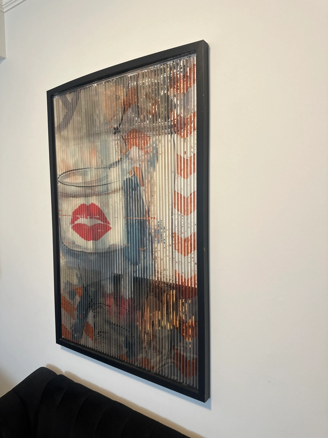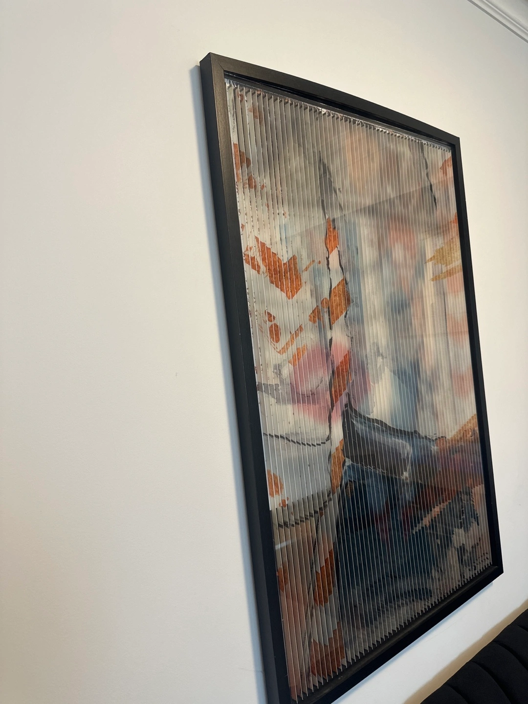 12I'm selling a framed lenticular 3D wall art piece. It's a unique piece that adds a cool visual effect to any room. The frame is black and the artwork features a modern design. 32*46