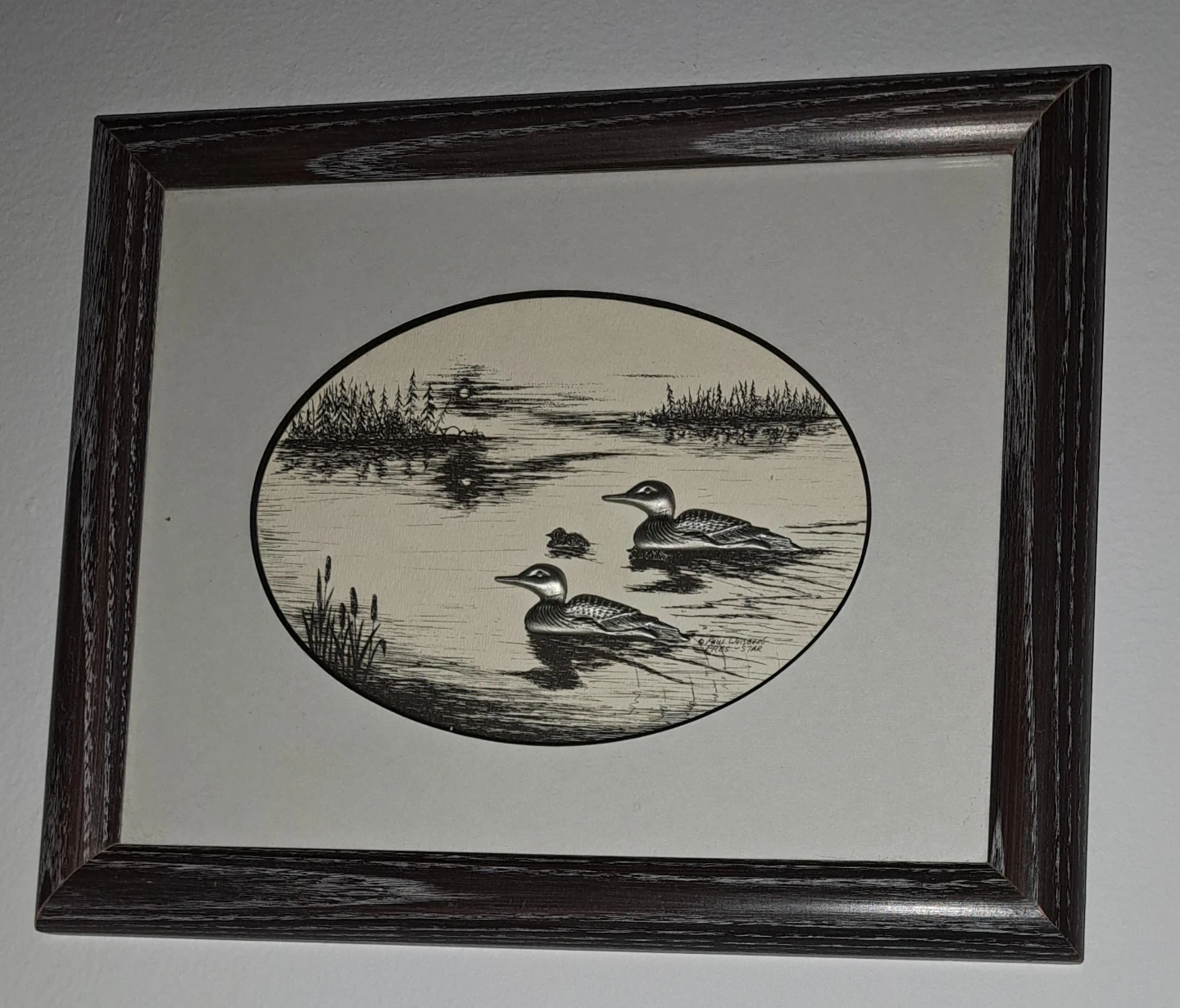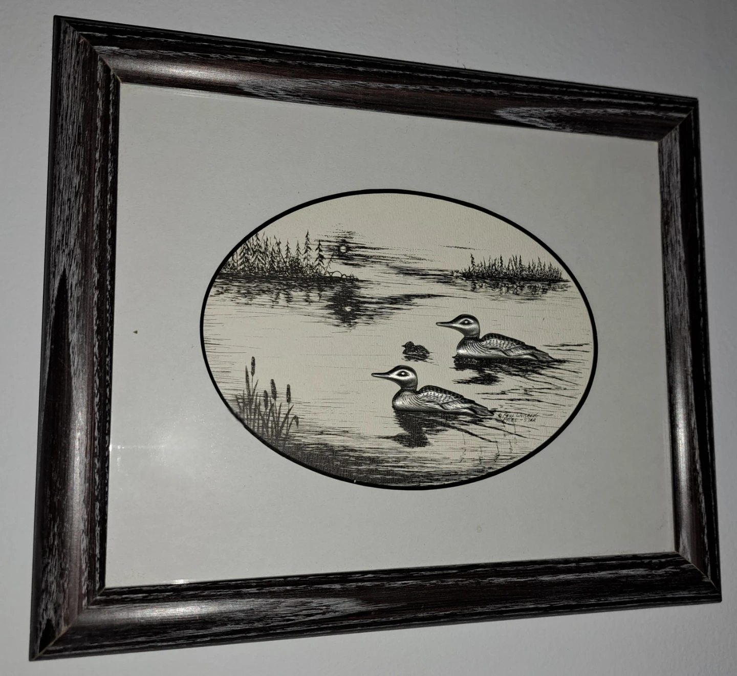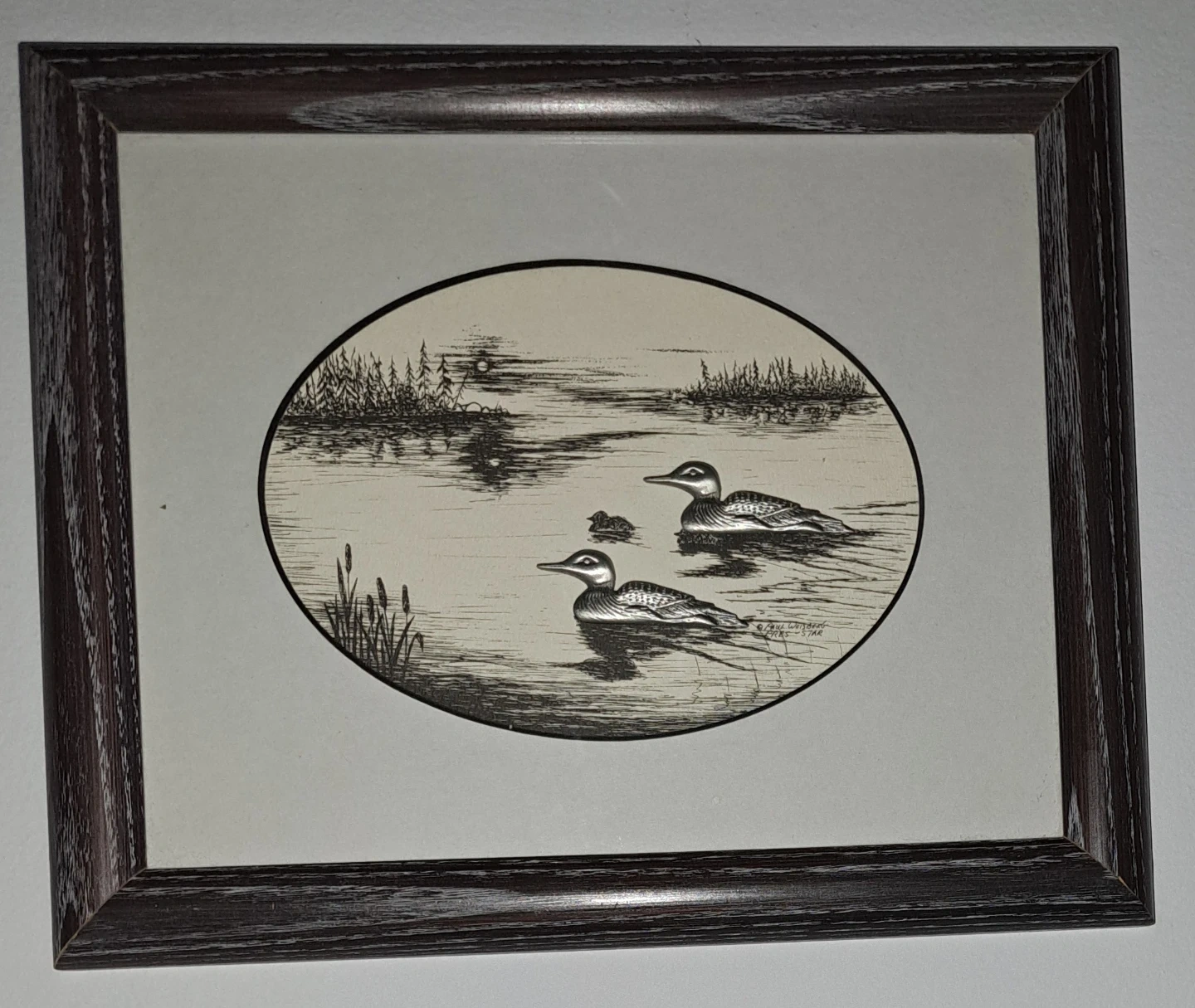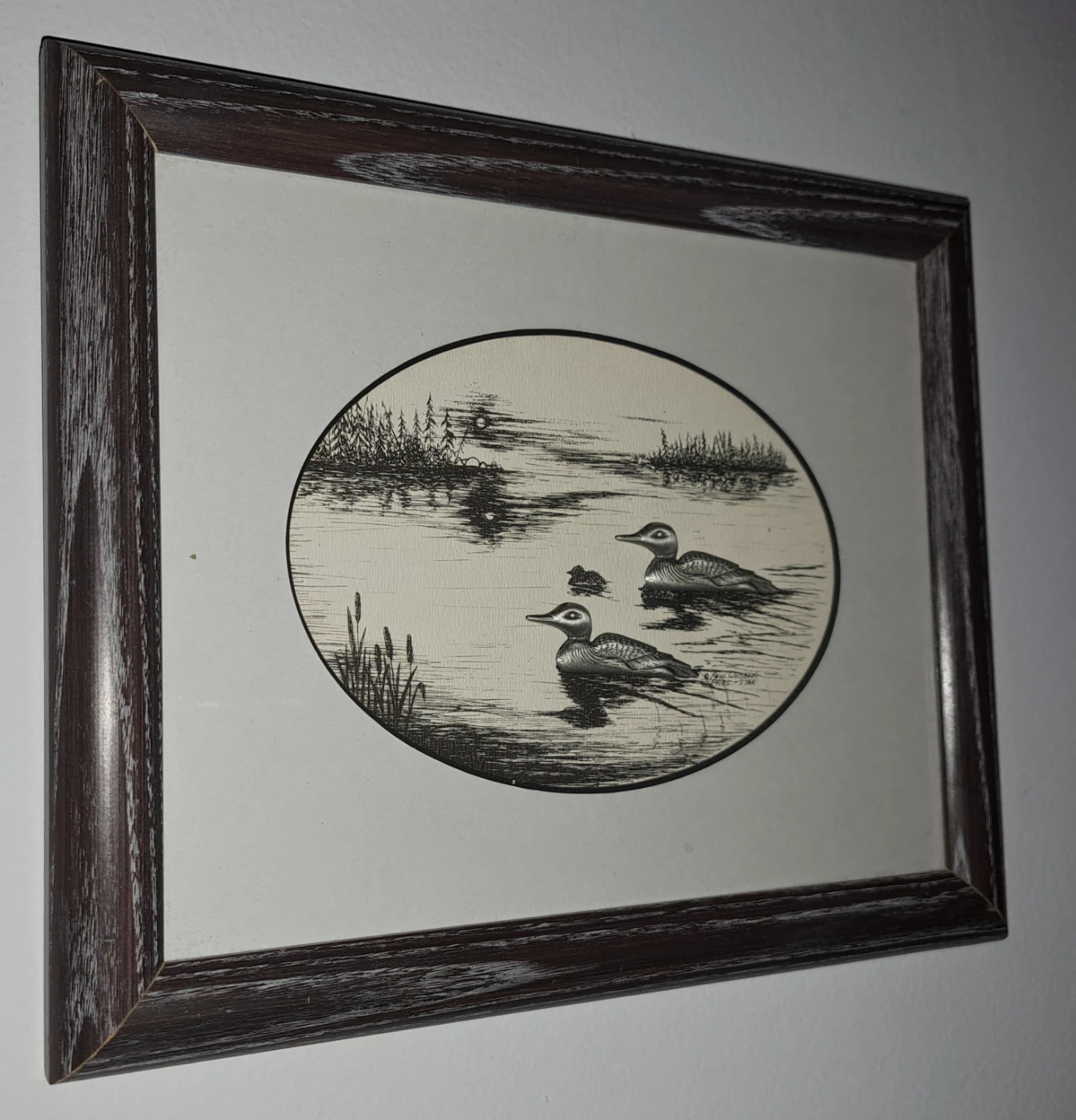 213Small, framed print featuring a lovely loon scene. It's in excellent shape, no chips, cracks or damage. The silver coloured loons are raised against the background. This would make a fantastic photo for the cottage. From a smoke free home. $20 ca$h